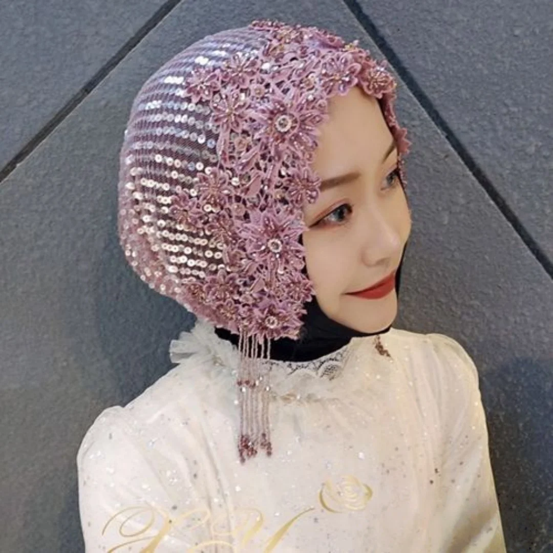 Turban Fashion Unique Hat Women's Retractable Retro Beaded  Muslim  Hat Lace Material with Beads Comforta Hijab
