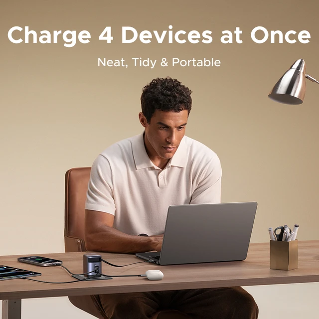 With 1 built-in retractable cable, 2 USB-C ports, and 1 USB-A port, this compact GaN charger delivers fast charging to up to 4 devices simultaneously.One charger, total convenience!