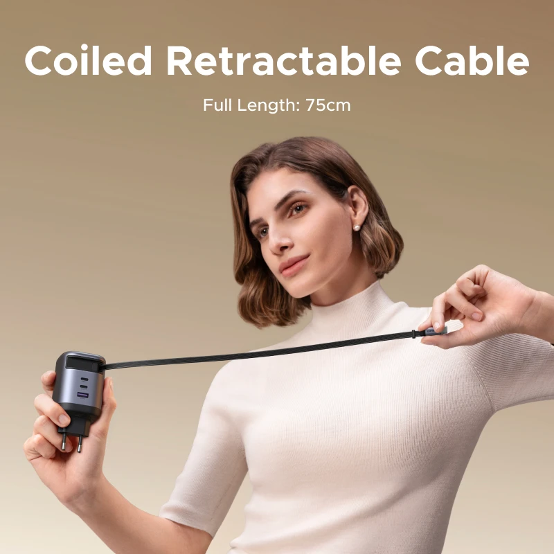 Delivers blazing-fast 100W output via USB-C ports (single-device), charging a MacBook Pro 14″ M4 Pro up to 54% in 30 minutes.Retractable coiled cable (75cm full length) eliminates clutter and portability issues.