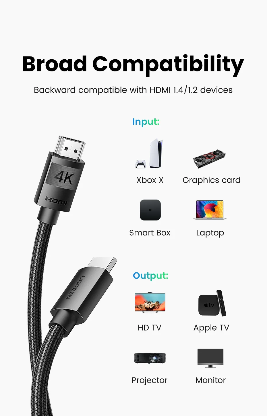 UGREEN HDMI UHD Video Lead supports High-Dynamic Range(HDR) to expand color gamut and contrast ratio of your TV, so you can enjoy life-like accuracy, breathtaking details and vibrant HDR visuals on 4K HDTV / UHD TV.