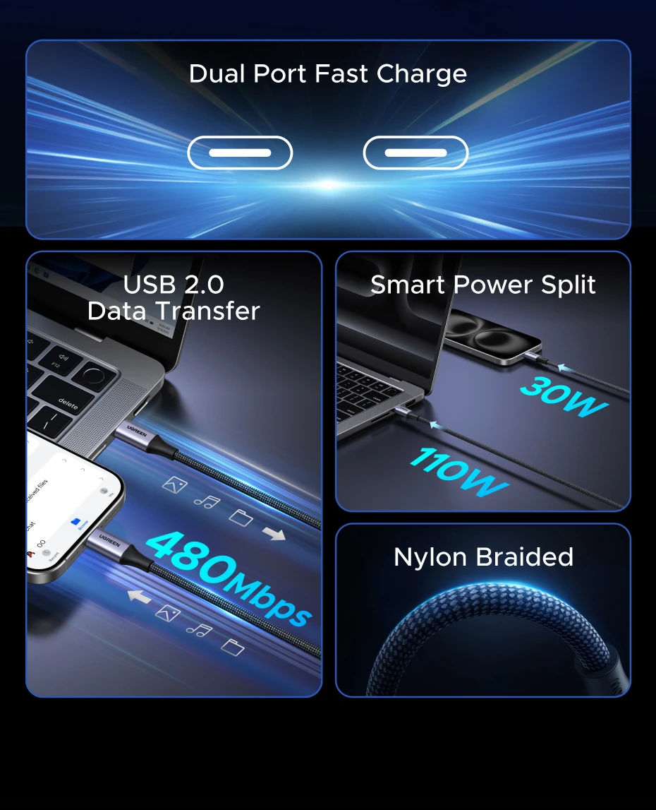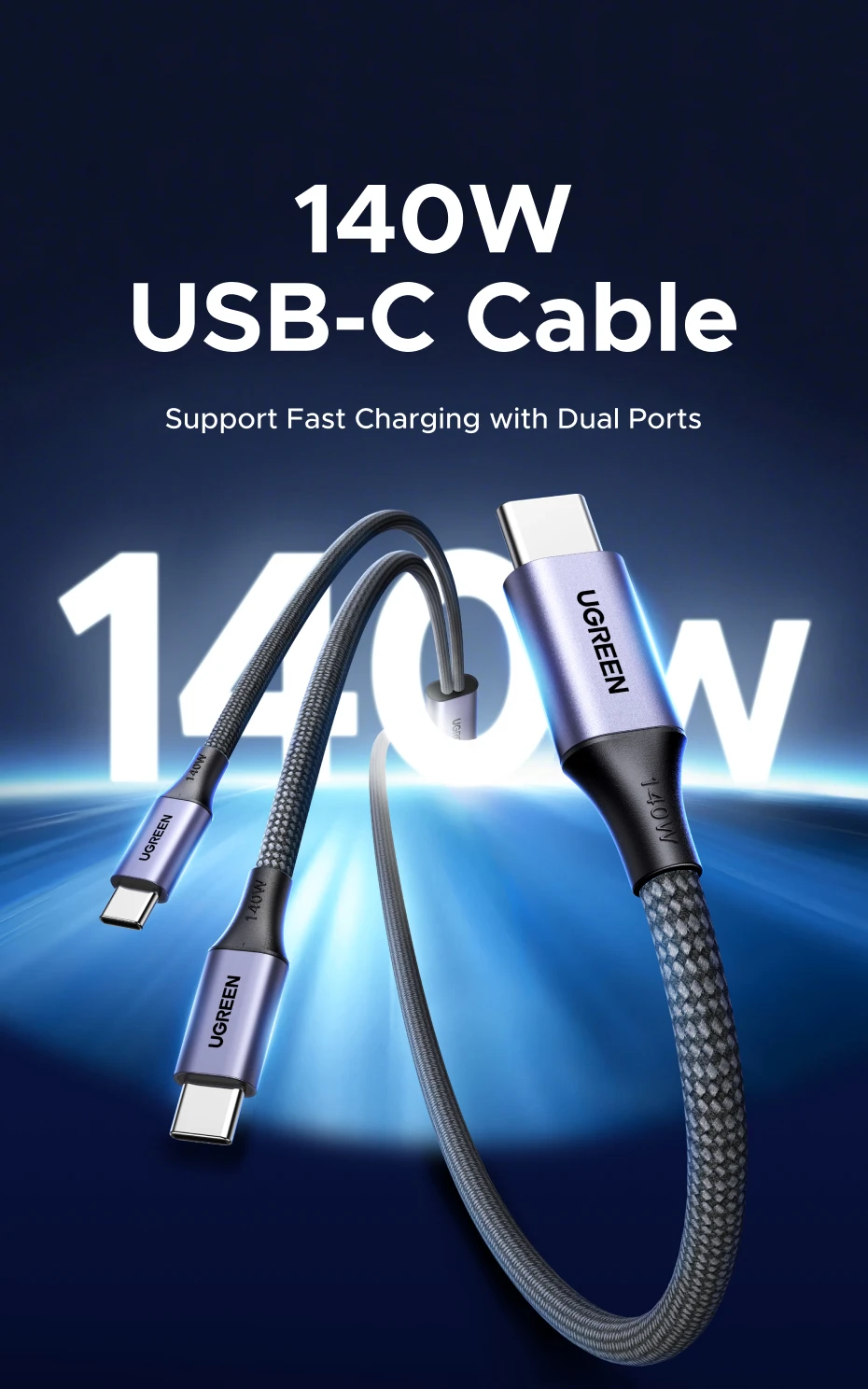 UGREEN USB C Cable 2-in-1 140W PD3.1 Fast Charging 1 to 2 Type C Braided Nylon Cord for iPhone16 iPad Samsung MacBook Dual USB-C
