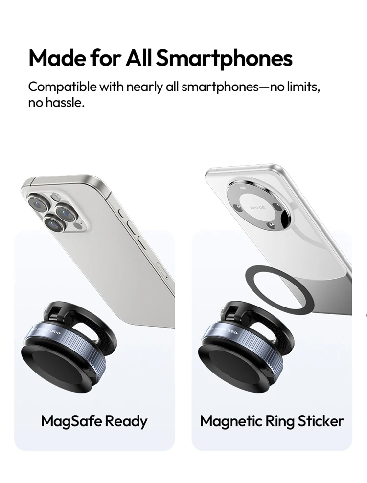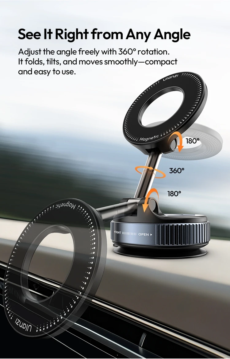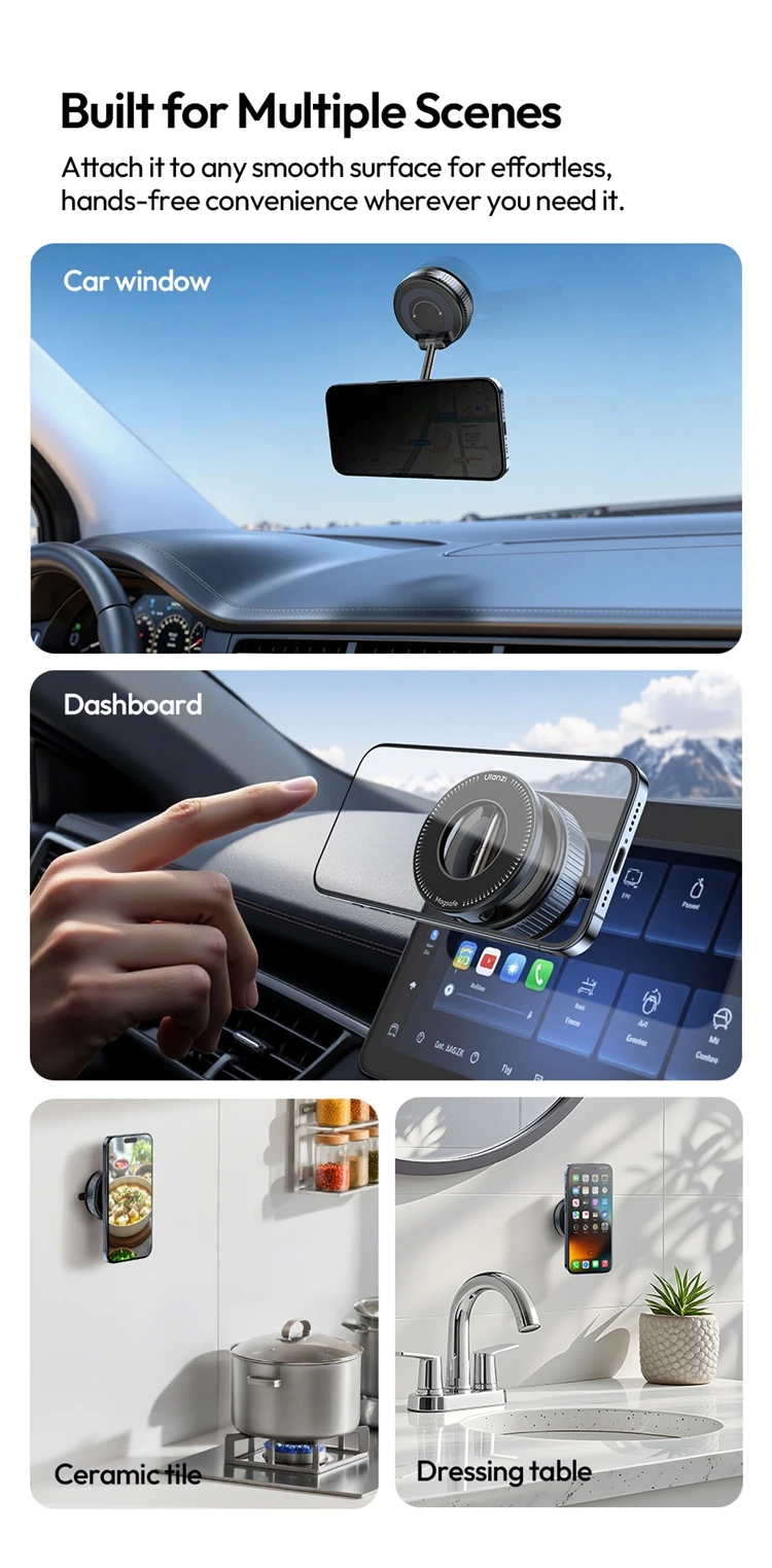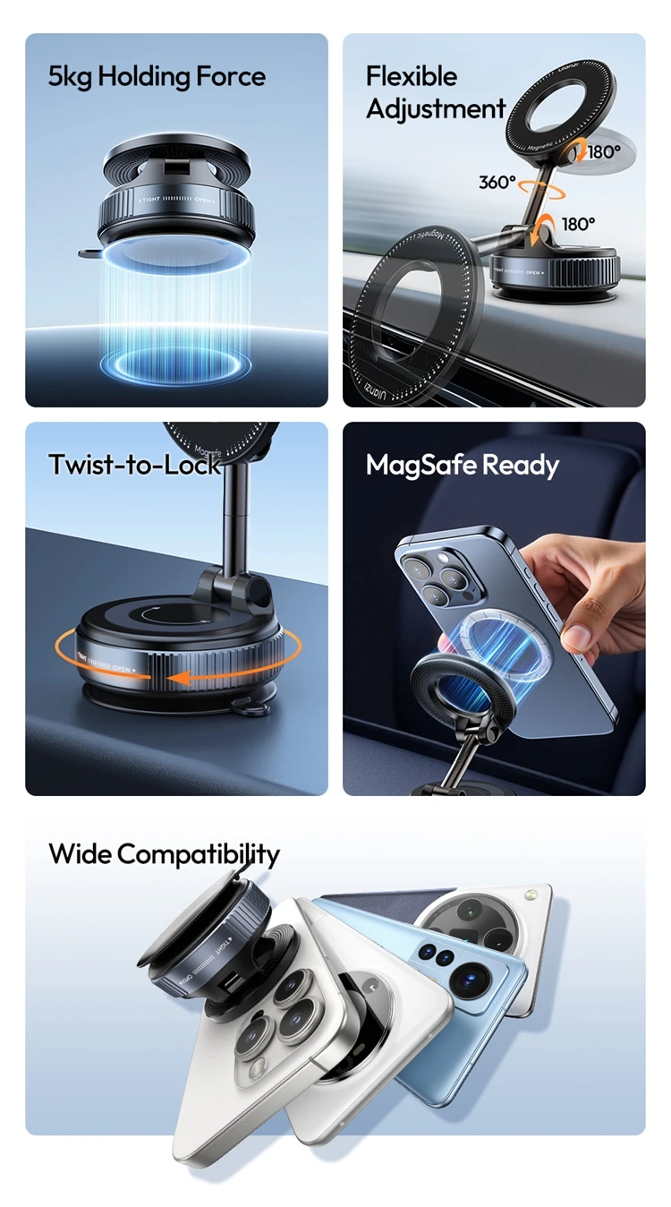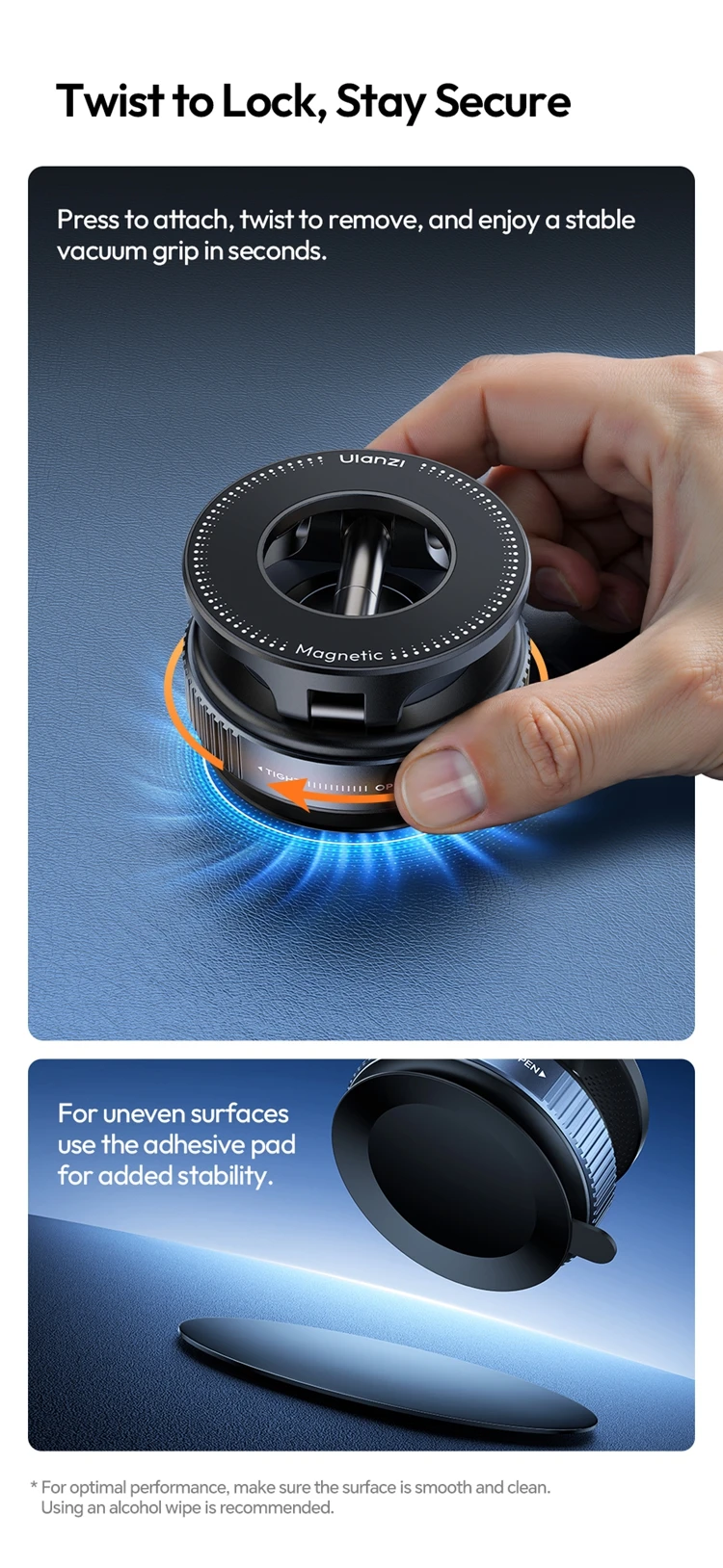 Press to attach, twist to remove, and enjoy a stable vacuum grip in seconds.