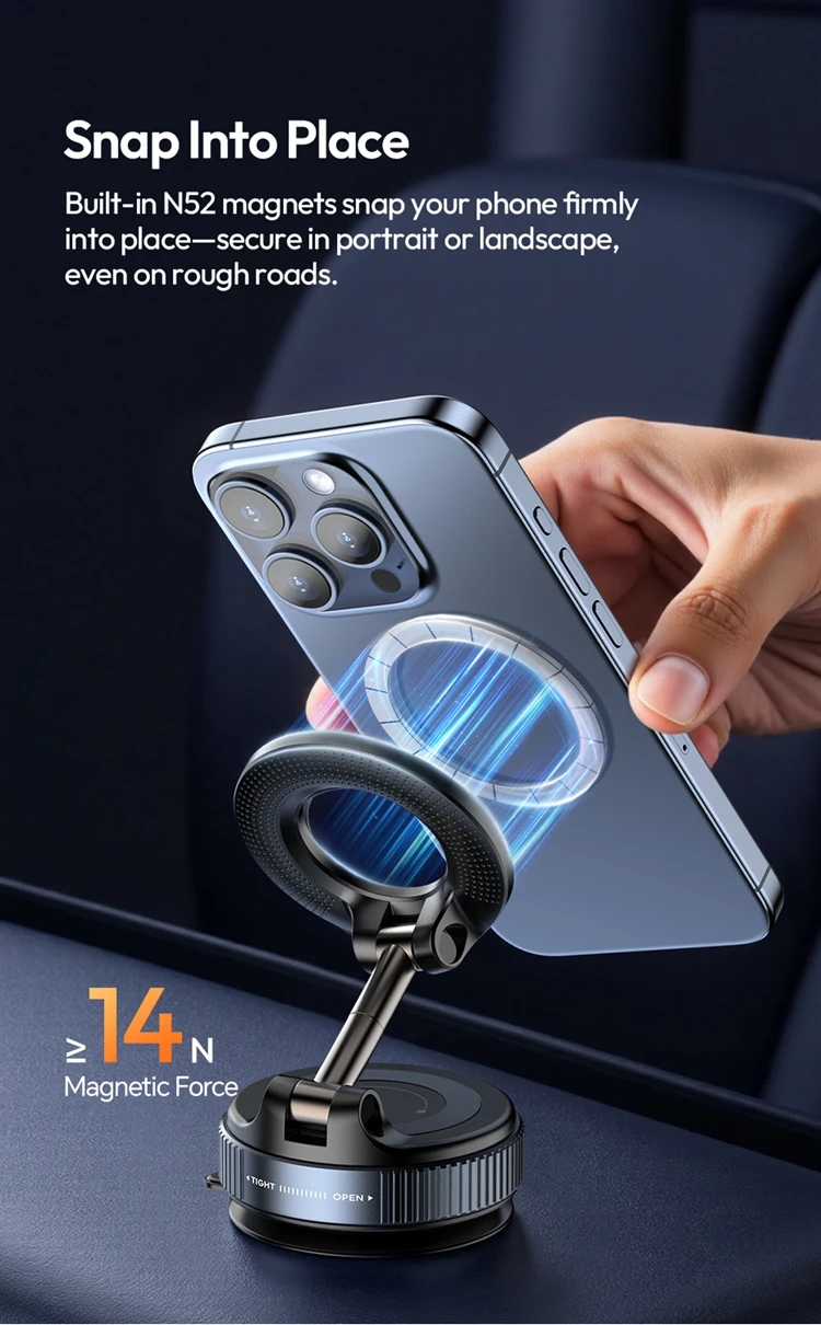 Built-in N52 magnets snap your phone firmly into place—secure in portrait or landscape, even on rough roads.