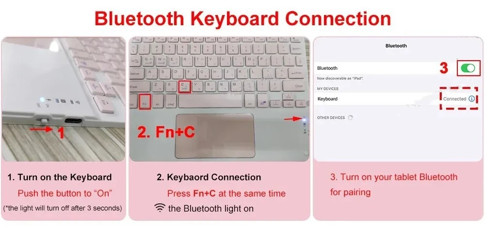 Switch Between 3 Devices Fast:Wireless Bluetooth Connection, Operating distance up to 10 meters. Just press Fn +Q/W/E to switch between 6 devices instantly. To make it even easier, every time you connect this keyboard with your device, it remembers the device so you can start typing instantly. Convenient for you to type at home, office, or the outside.