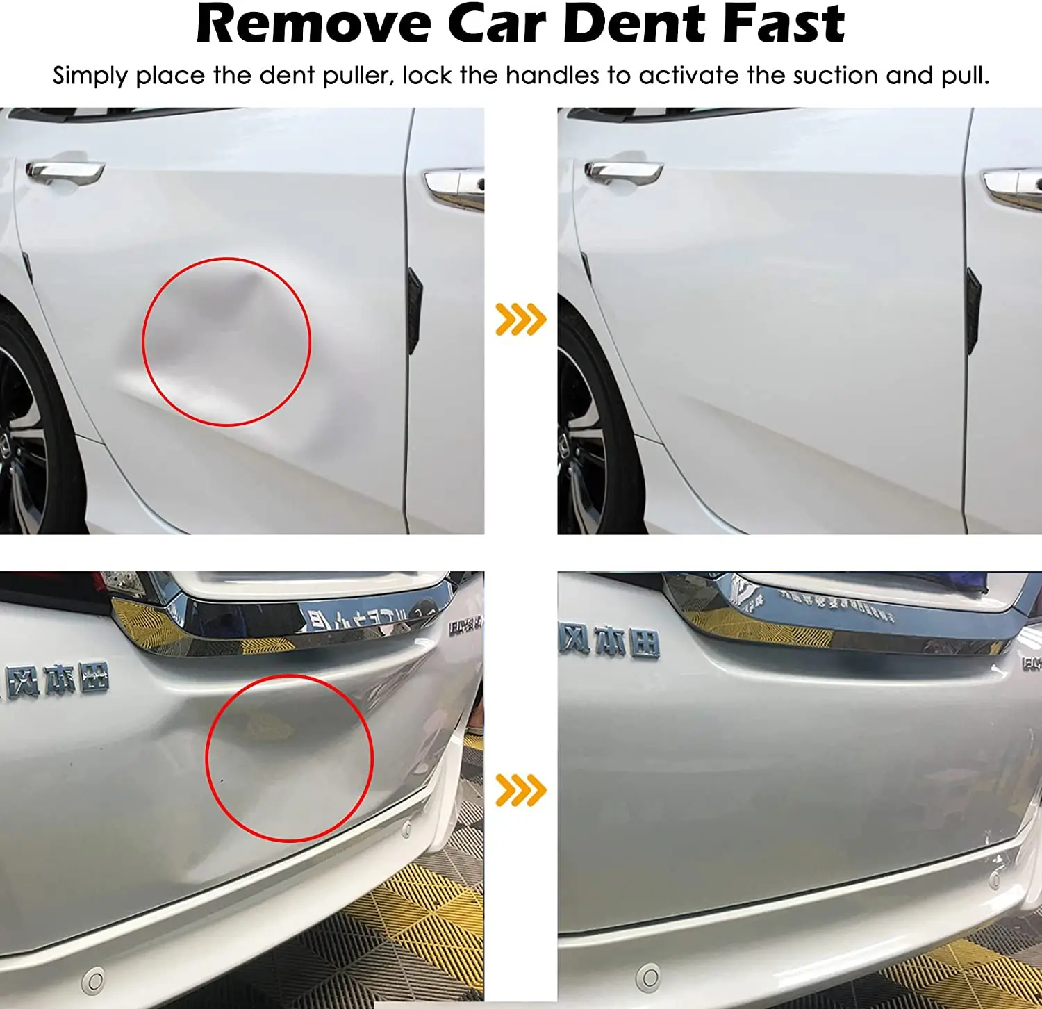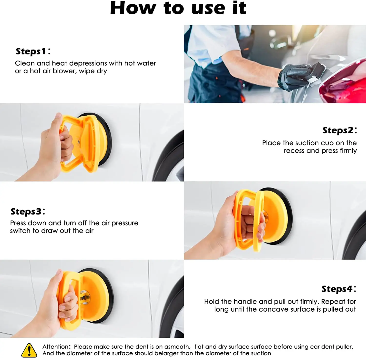 【Easy to use】Remove car dents in just 3 steps: Place the dent remover with the dent and press firmly; Combine the two handles to draw out the air inside the dent remover; Hold the handle and pull it out slowly.