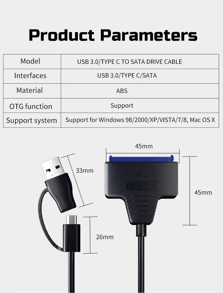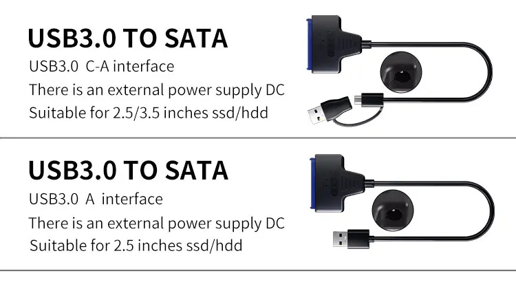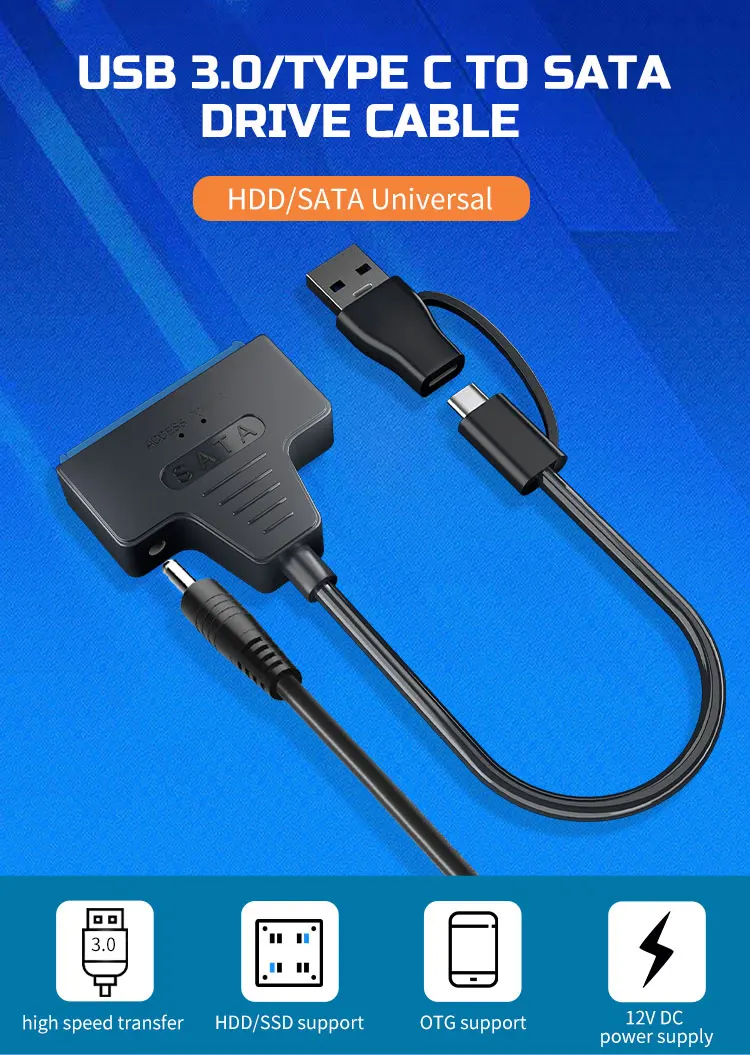 • USB 3.0 to SATA/Type-C Adapter :This adapter converts USB 3.0 into SATA/Type-C, allowing you to connect your SSD HDD SATA III hard drive disk to your PC.