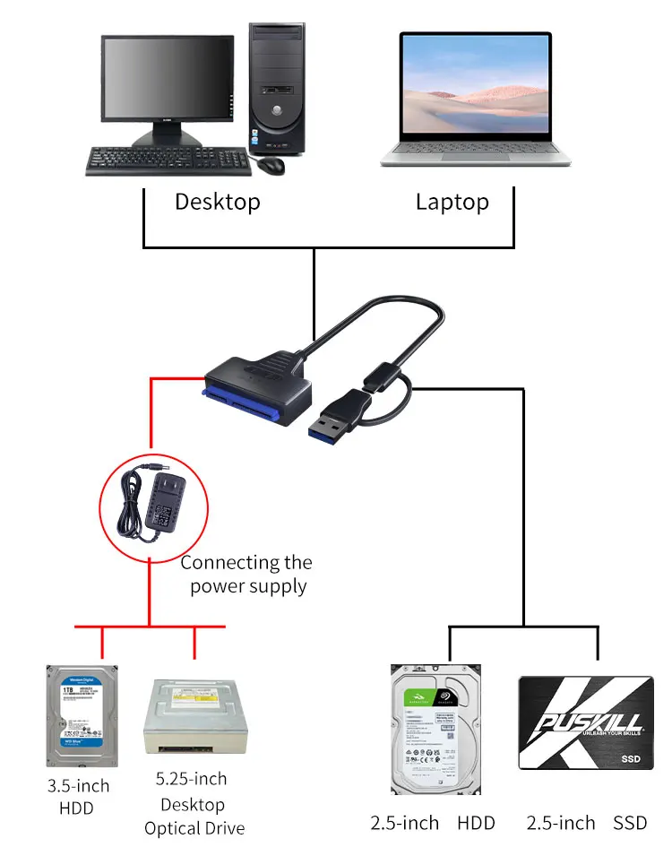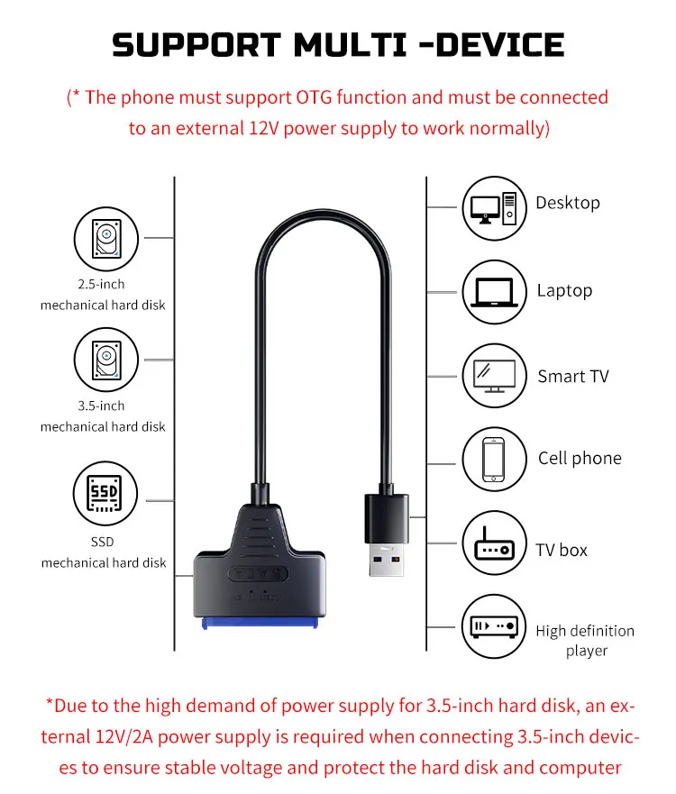 2.Due to the high demand of power supply for 3.5-inch hard disk, an external 12V/2A power supply is required when connecting 3.5-inch devices to ensure stable voltage and protect the hard disk and computer