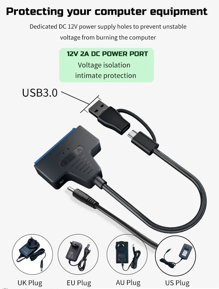 • 12V/2A Power Adapter :The included 12V/2A power adapter provides stable power supply for the adapter and hard drive disk, ensuring optimal performance.