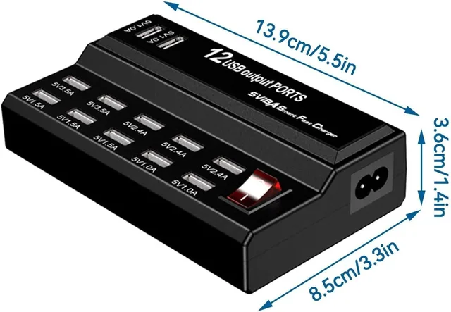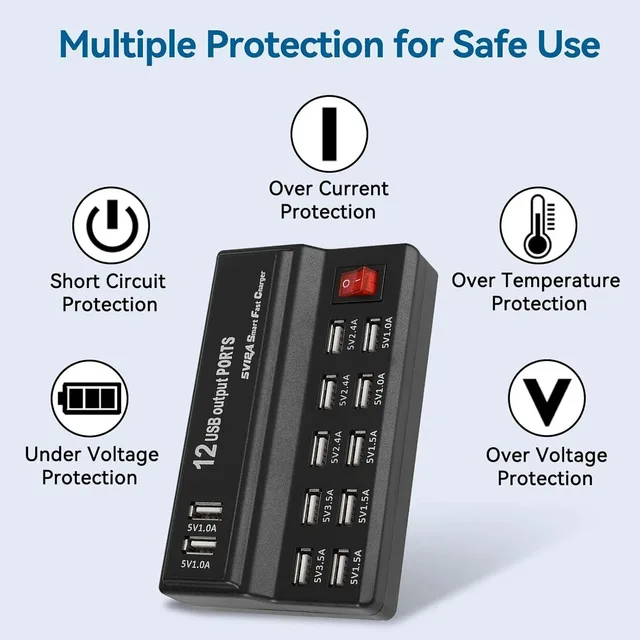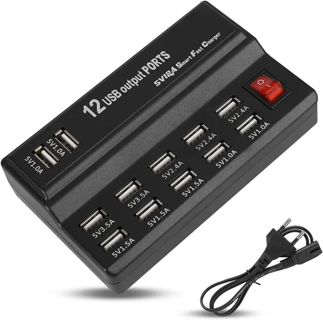12-Port USB Charging Station, Universal Multi-Device Charger Hub with 5V 12A 60W Output, Power Adapter with European Plug for Cell Phones and Tablets, 110V/220V Compatible, Compact Desk Design