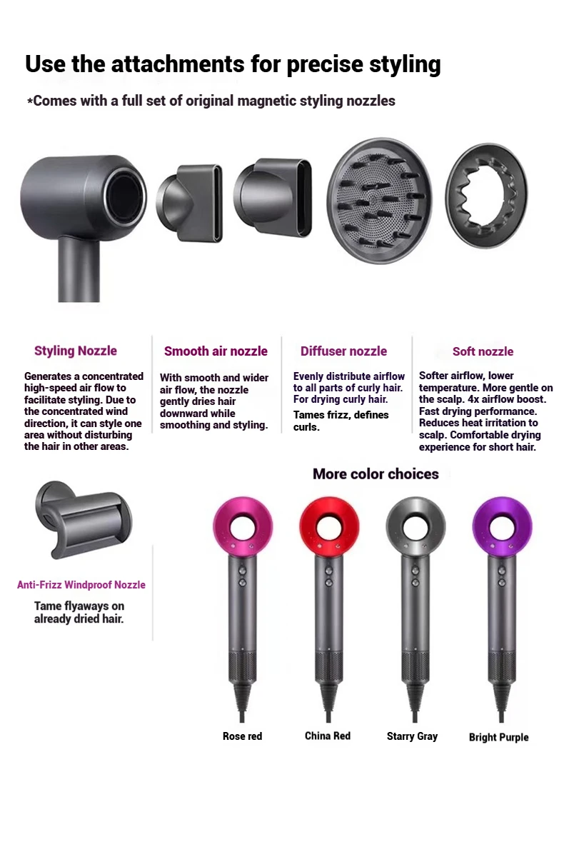 Nozzle Styles: Includes multiple magnetic styling nozzles for precise drying and styling.