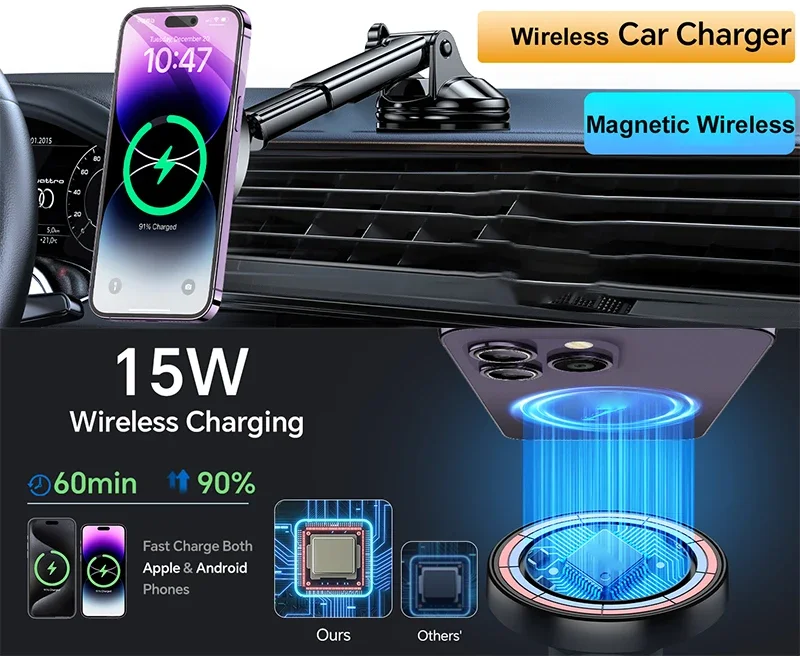 UYUXIO Magnetic Wireless Car Charger Windshield Dash 15W Fast Charging Adapter for iPhone 17 16 15 14 13 Car Mount Phone Holder