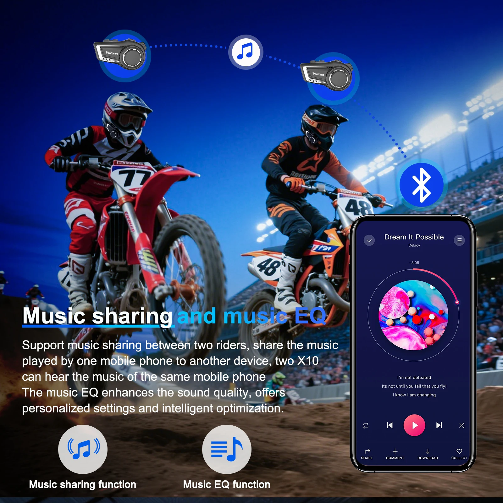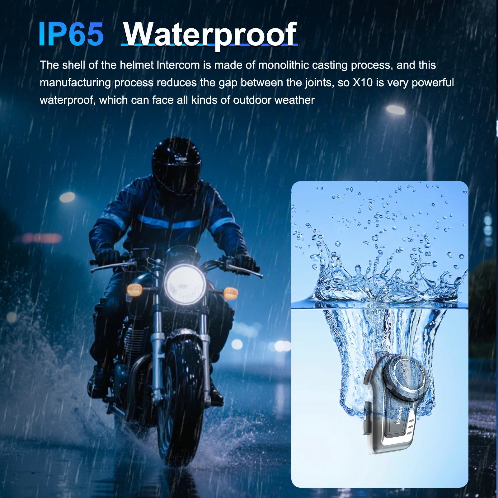 Sharing music between two riders, two X10 can hear the same music; Music EQ enhances the sound quality, offers personalized settings  and intelligent optimizationIP65 Waterproof