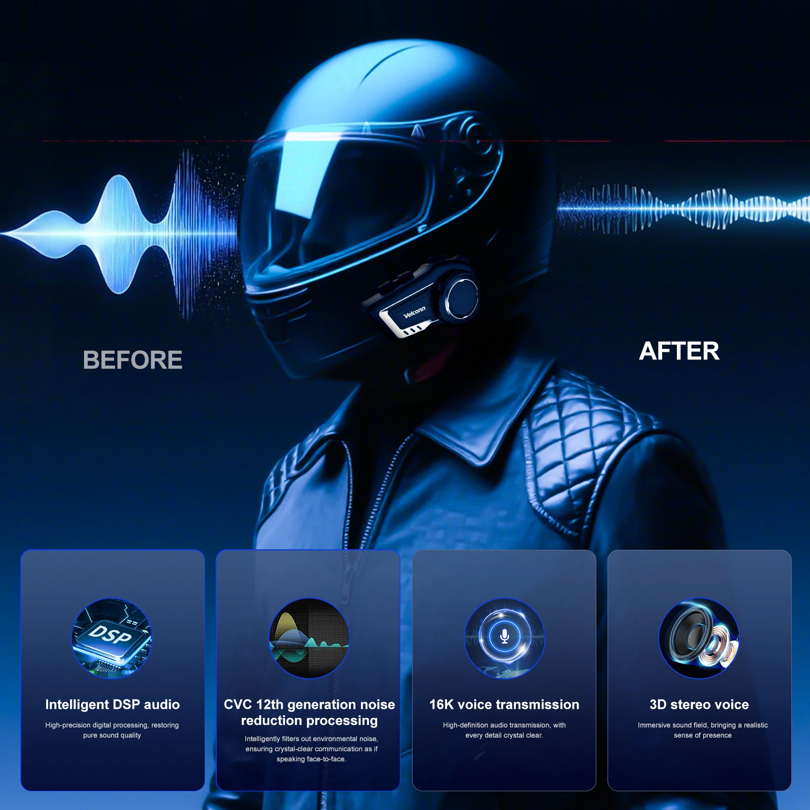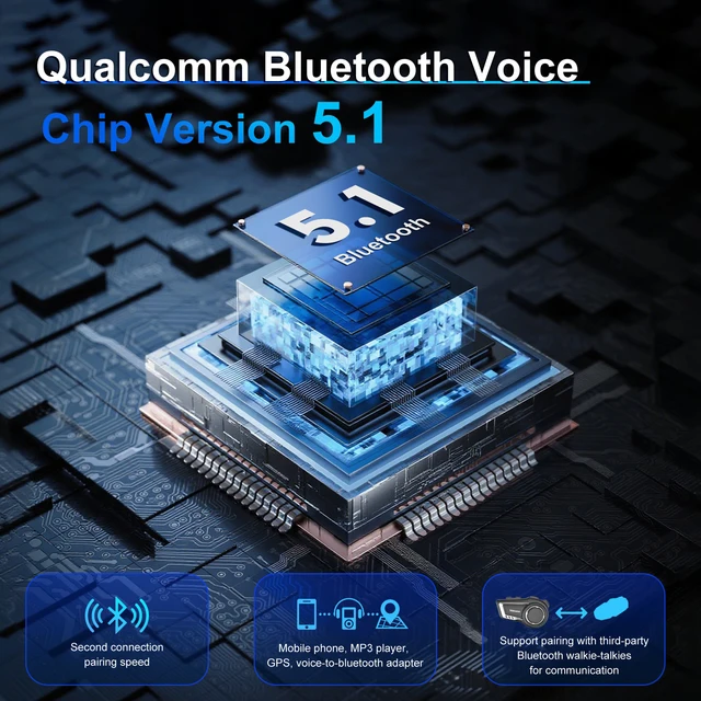 Qualcomm Chip, Bluetooth 5.11500M distance pair communication for 10 riders(Ideal distance)Intellegent DSP audio; CVC 12th generation noise reduction  processing; 16K voice transmission;3D stereo  voiceMusic Sharing/Music EQ