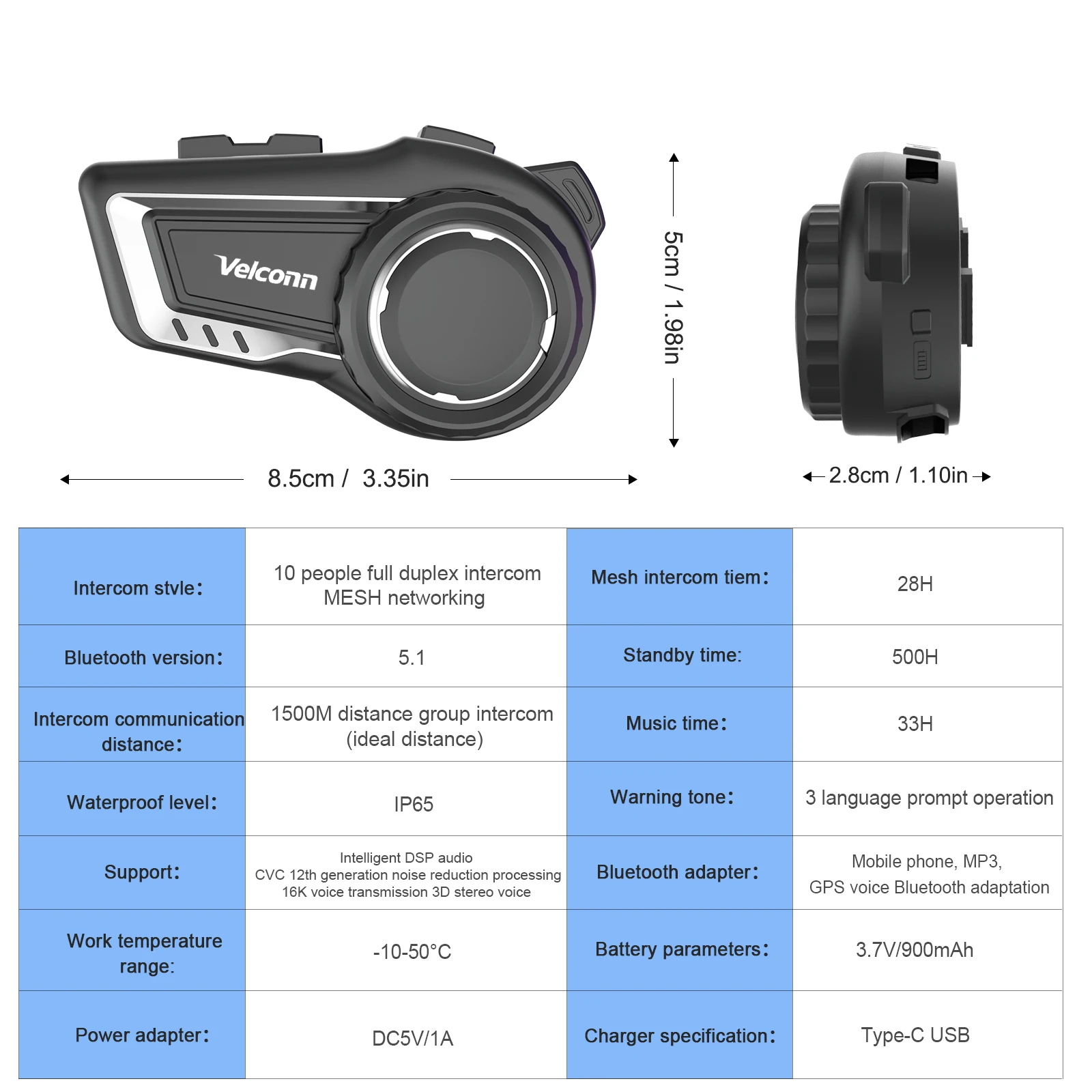 Velconn X10 Motorcycle Mesh Intercom Helmet Headset Bluetooth 5.1 For 10 Riders 1500M Full Duplex Interphone