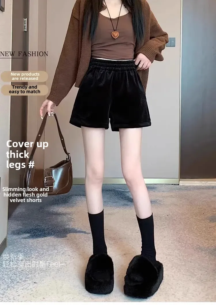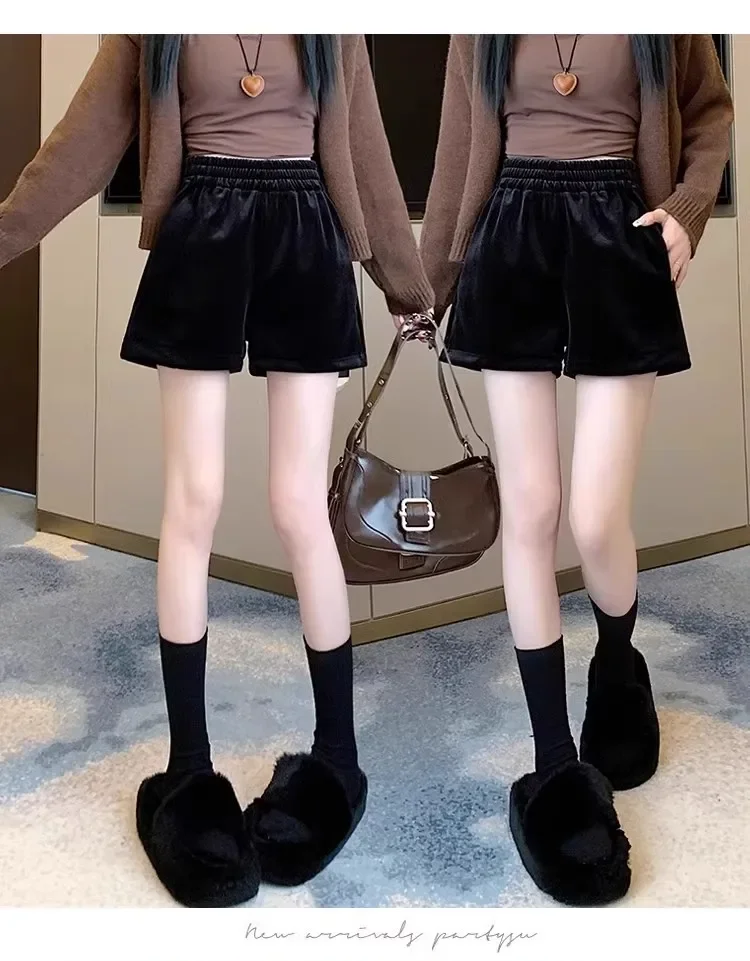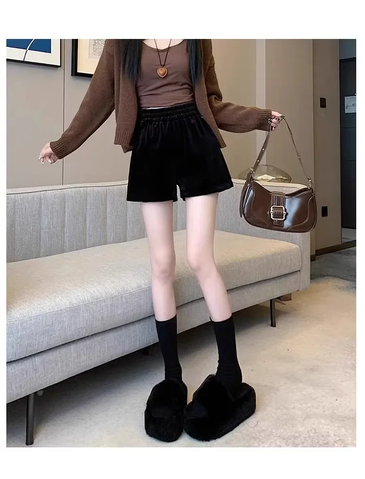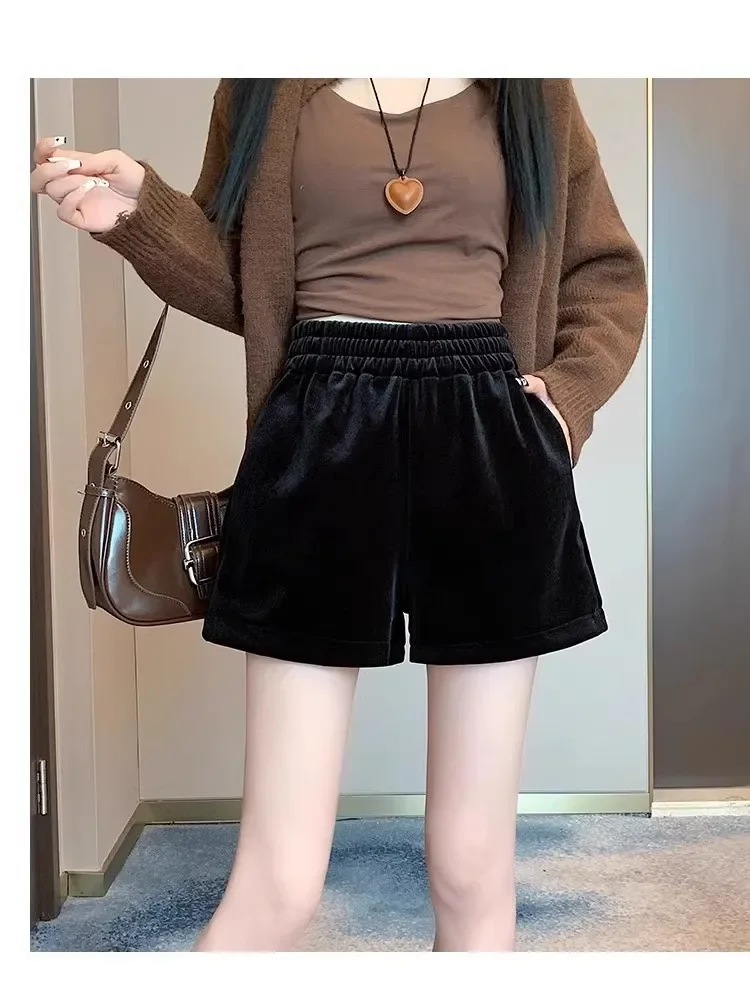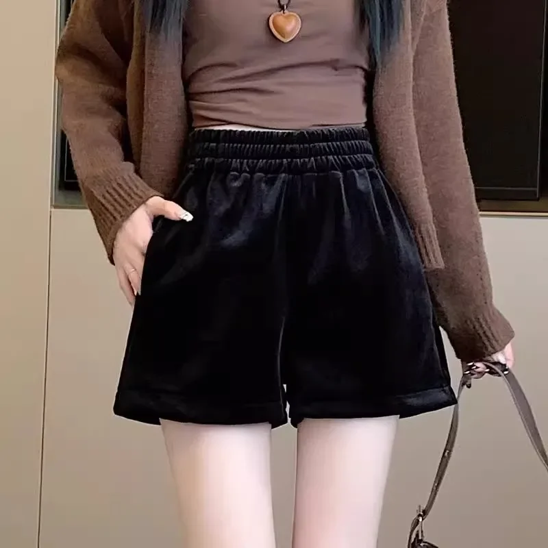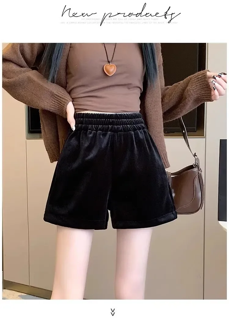 Velvet Wide Leg Shorts Women’s Outerwear Autumn Winter New Elastic Waist Fashionable Black Slimming