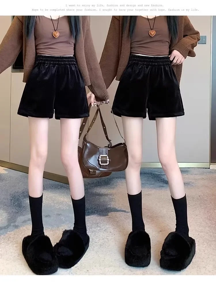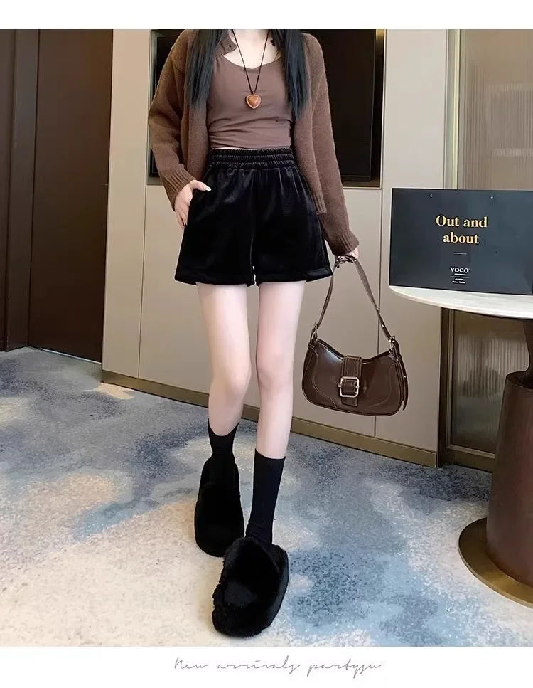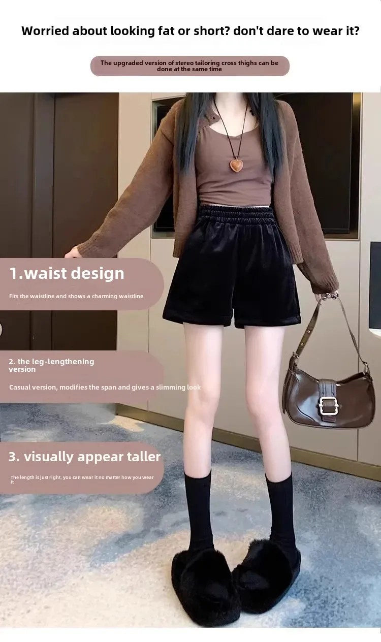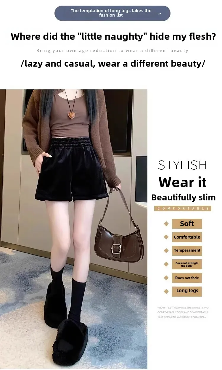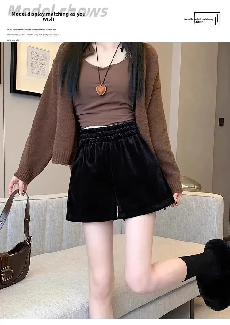 Velvet Wide Leg Shorts Women’s Outerwear Autumn Winter New Elastic Waist Fashionable Black Slimming