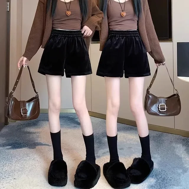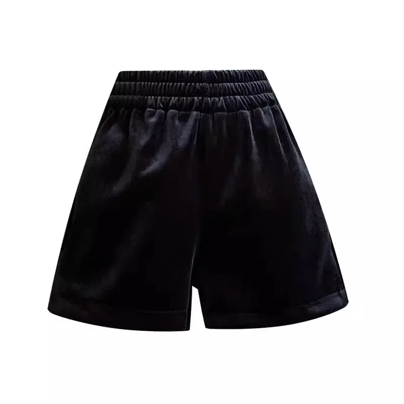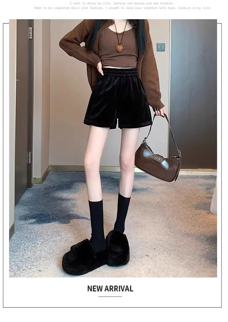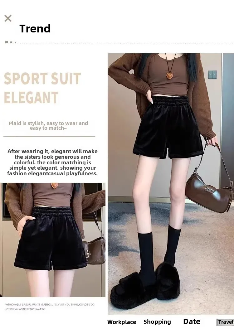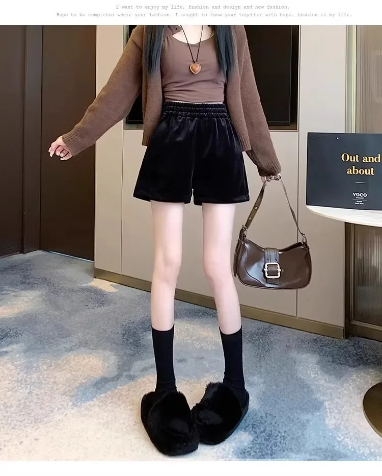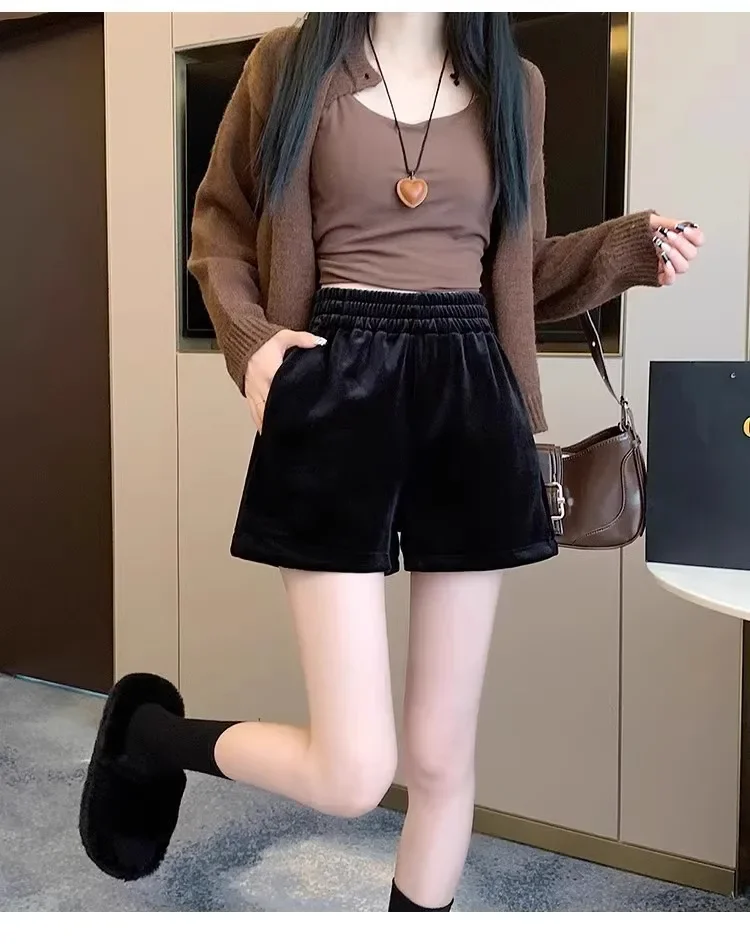 Velvet Wide Leg Shorts Women’s Outerwear Autumn Winter New Elastic Waist Fashionable Black Slimming