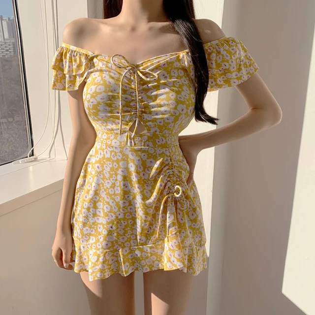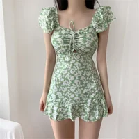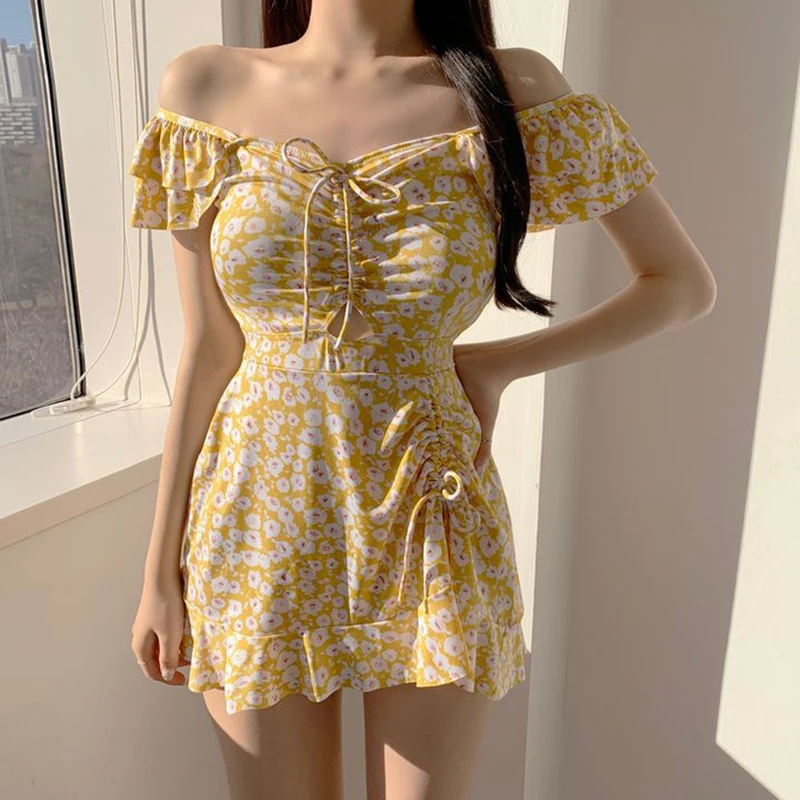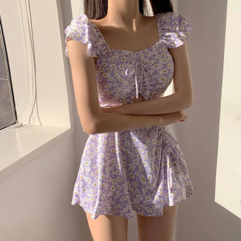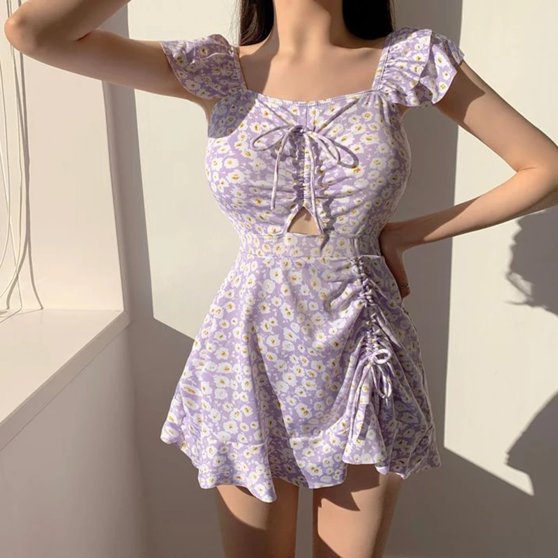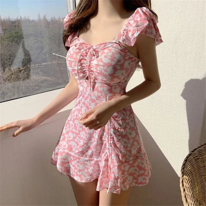 Vintage Blue Floral Print Korean Swimsuit Dress One Piece Swimwear Women 2025 Beach Wear Ruffled Drawstring