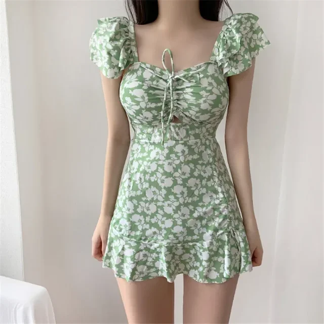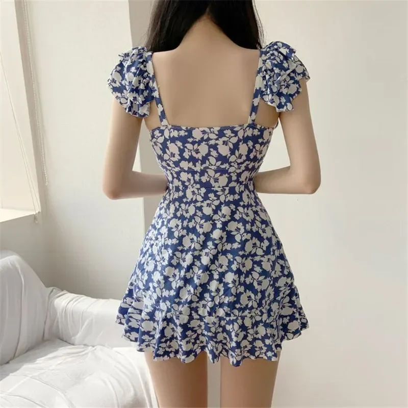 Be the first to review “Vintage Blue Floral Print Korean Swimsuit Dress One Piece Swimwear Women 2025 Beach Wear Ruffled Drawstring”