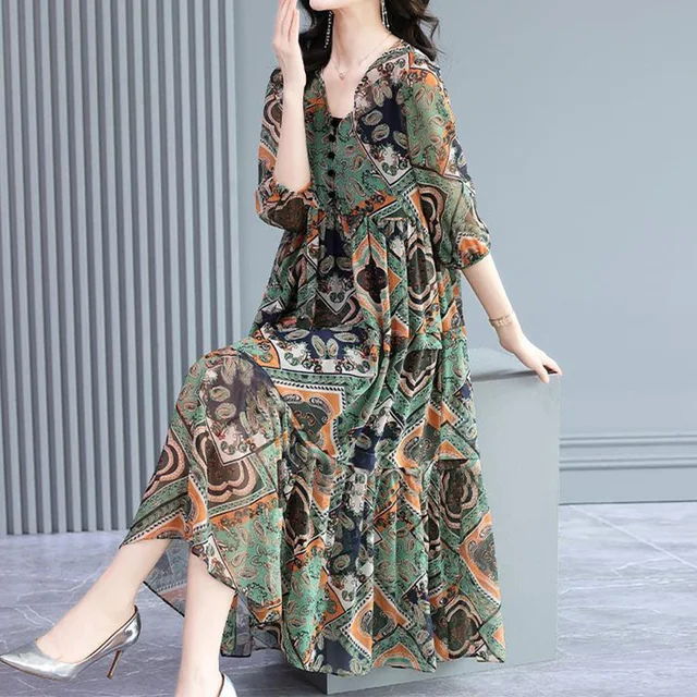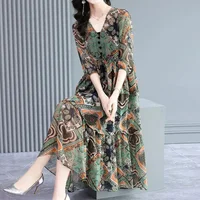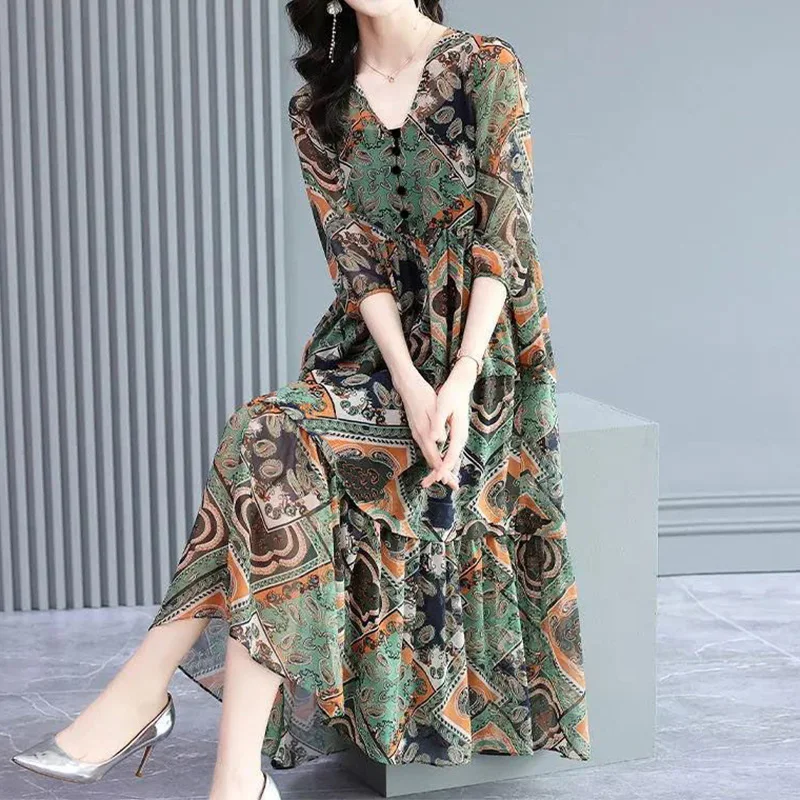 Vintage Elegant Floral Printing Button Chiffon Dresses Summer 2023 Half Sleeve V-Neck Loose Pullover