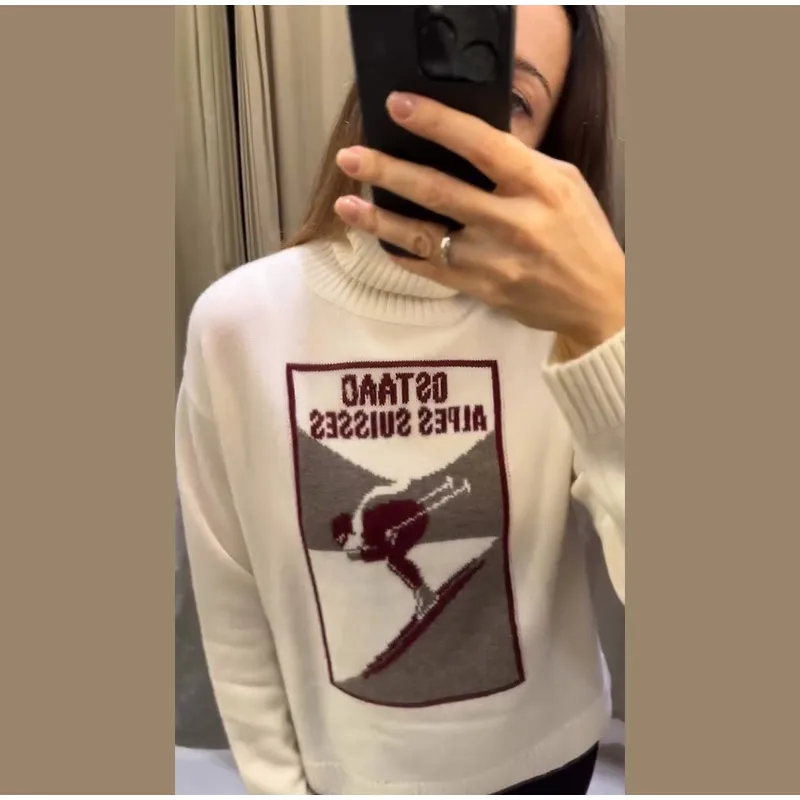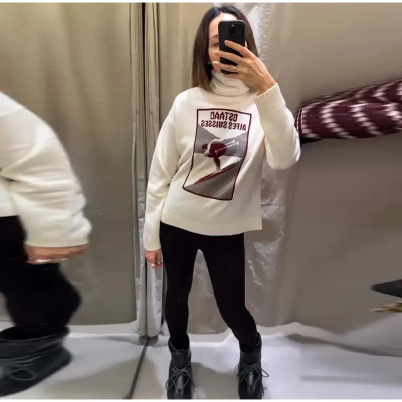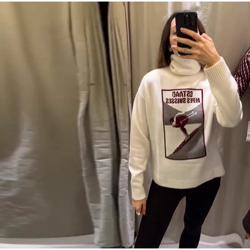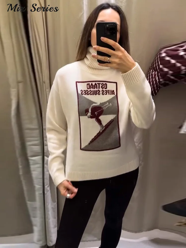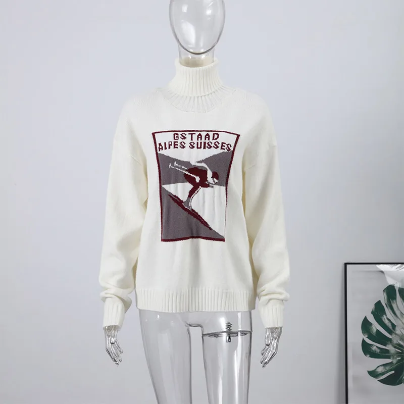 Vintage Ski Pattern Sweater Women's Loose Turtleneck Long Sleeve Knitting Warm Pullover 2026 Spring New Lady Fashion Streetwear