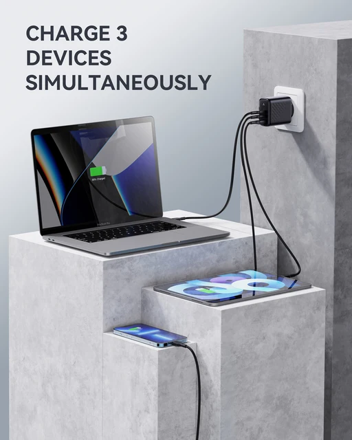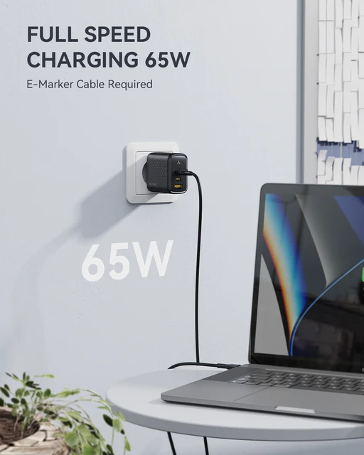 Connect a single device to get a 65W max charge, which charges your MacBook Air from 0 to 100% in less than 2 hours, an iPhone 13 up to 3x faster than an original 5w charger, charge MacBook Pro at full speed, and it support PPS for samsung adaptive fast charging.