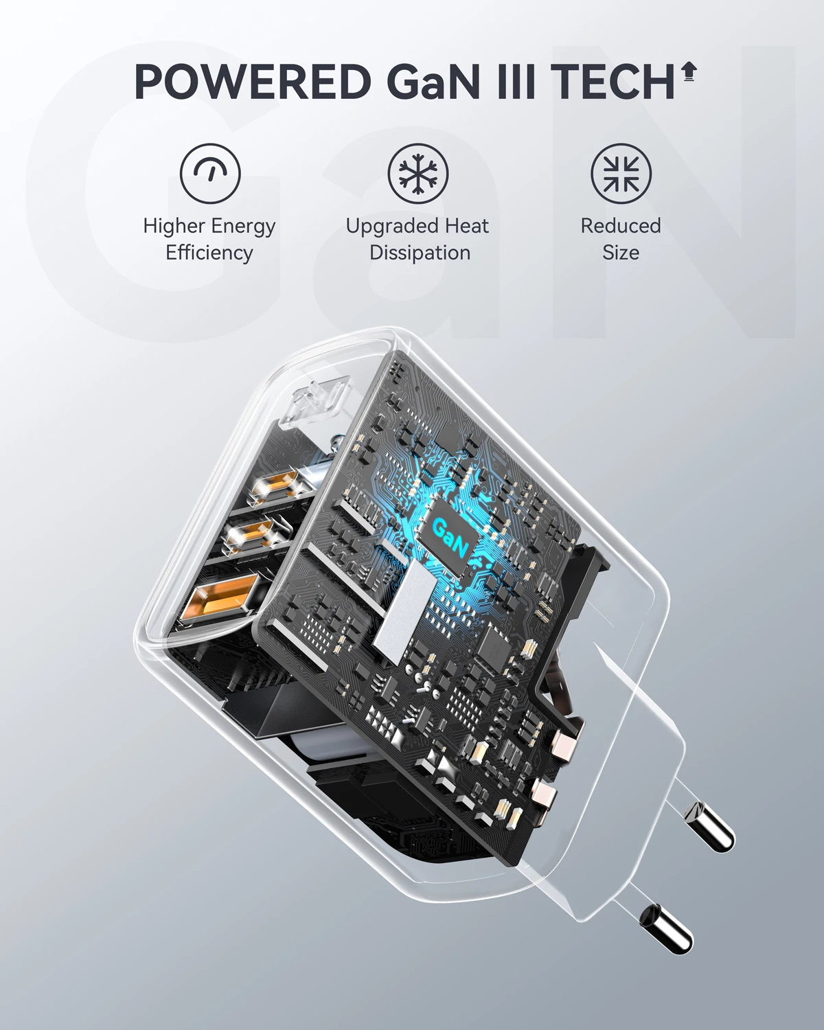 USB-C fast charger adopt the latest GaN III Tech which provide safer and more reliable charging. Reduce the size of our chargers without compromising power.