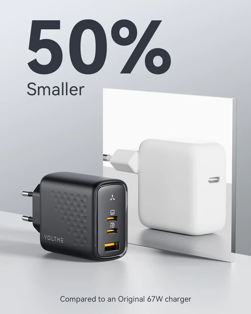 At 50% smaller than an original 67W USB-C charger, and with a foldable plug, VOLTME Revo 65 compact and intuitive design makes on-the-go charging easy.