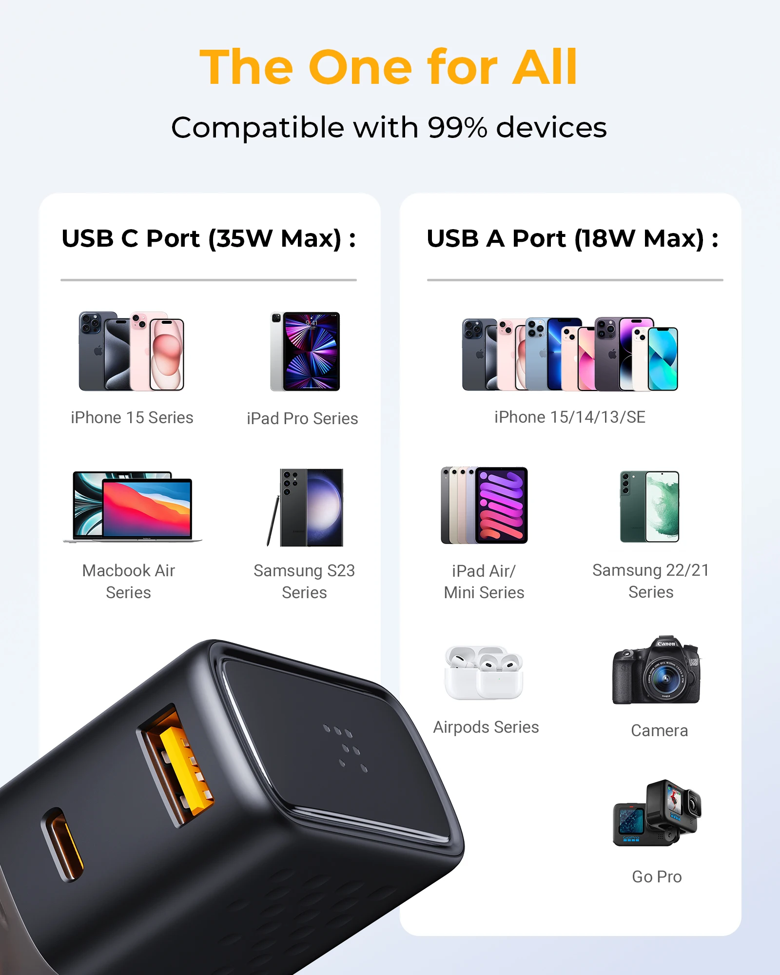 ● USB-C: 3.3-11V 3A (PPS)/5V 3A/9V 3A/12V 2.91A/15V 2.33A/20V 1.75A (35W Max)