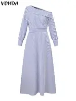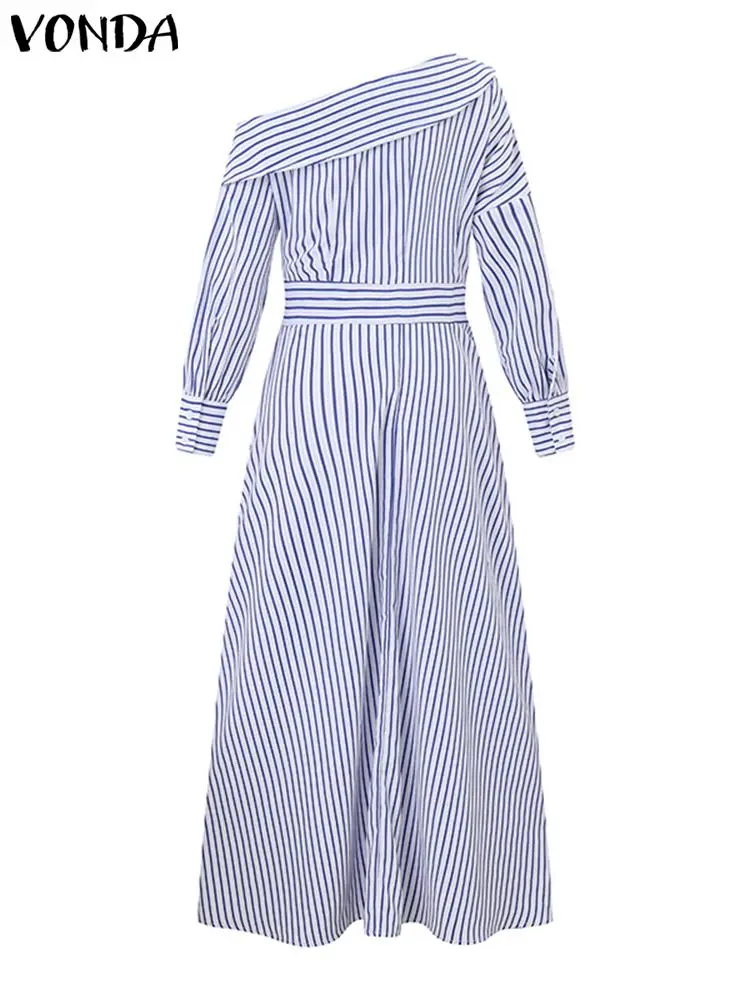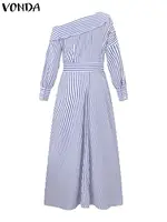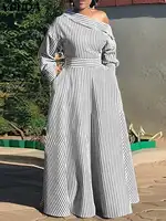 Features:Single shoulder, long sleeves, side pockets, stripes, ankle length dress