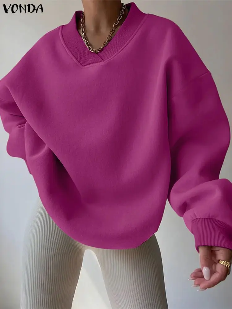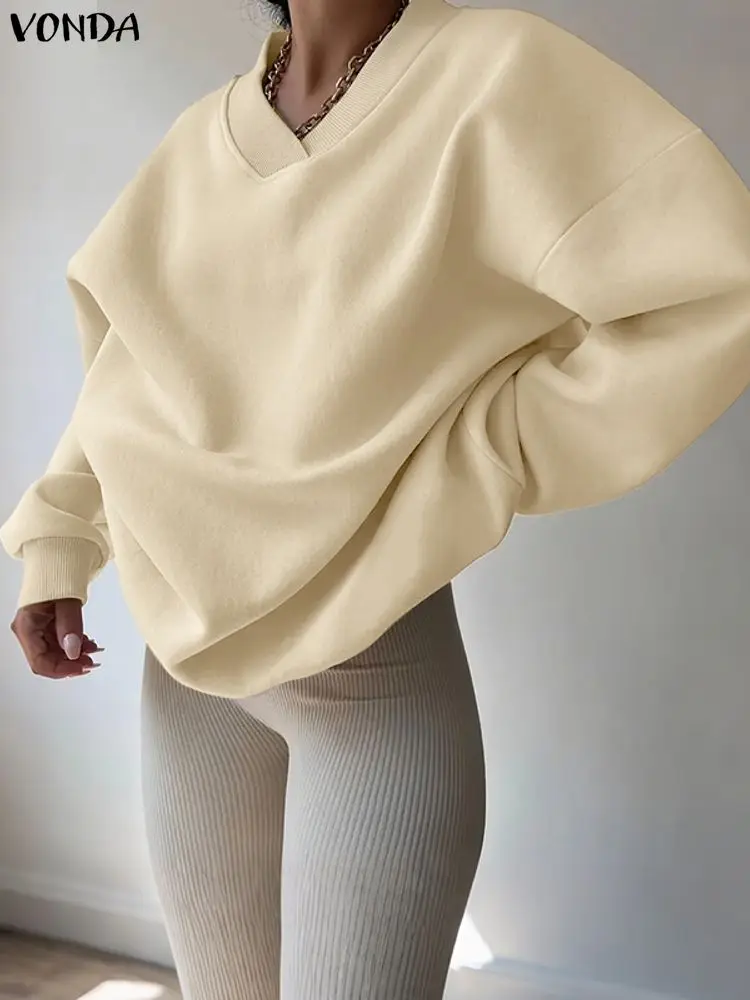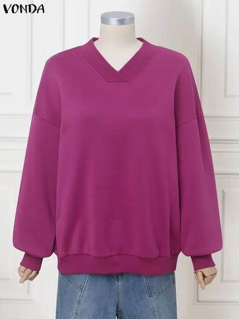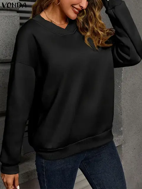 Plus Size 5XL VONDA Fashion Women Sweatshirts Long Sleeve Solid Pullovers 2025 Autumn V-Neck Casual Jumpers Loose Elegant Shirts
