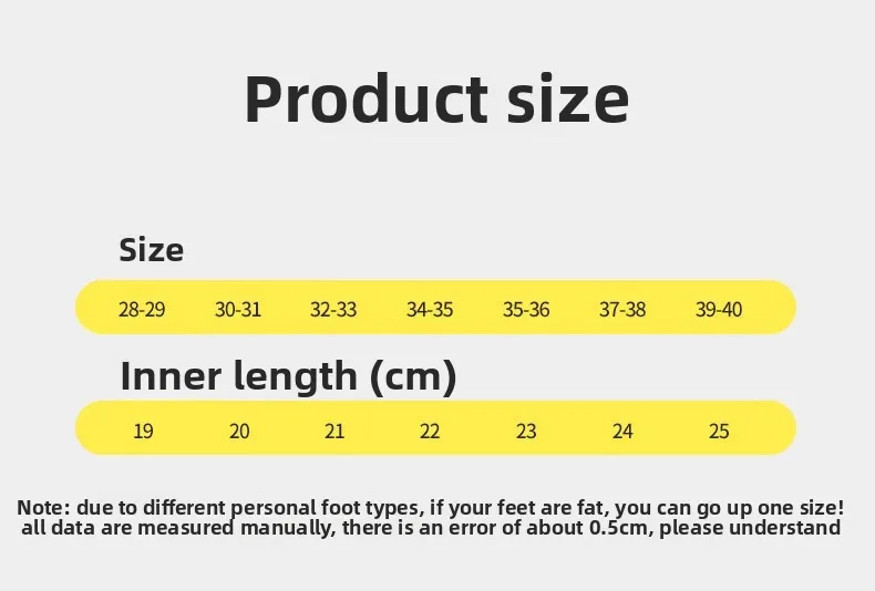 28-29 (inner length 19CM)30-31 (inner length 20CM)32-33 (inner length 21CM)34-35 (inner length 22CM)36-37 size S (suitable for ordinary wear 35-size 36)38-39 size M (suitable for wearing 37-size 38 at ordinary times)40-41 size L (suitable for ordinary wear 39-size 40)