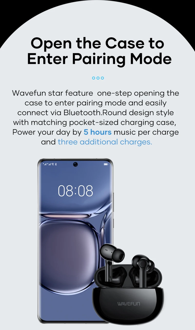 Wavefun Star feature one-step opening the case to enter pairing mode and easily connect via Bluetooth.Round design style with matching pocket-sized charging case, Power your day by 4 hours music per charge and three additional charges.