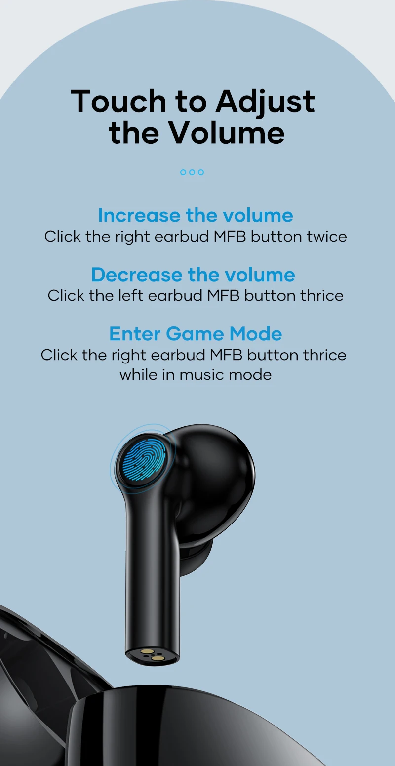Enter Game Mode: Click the right earbud MFB button thrice while in music mode