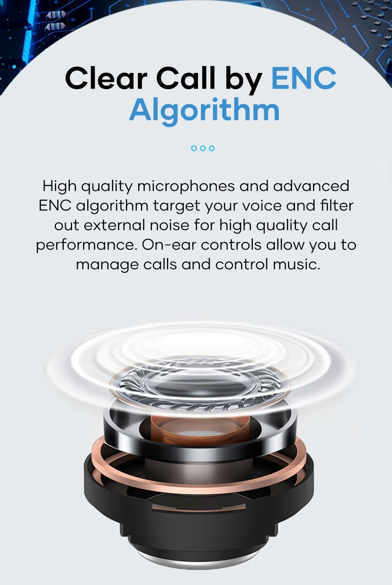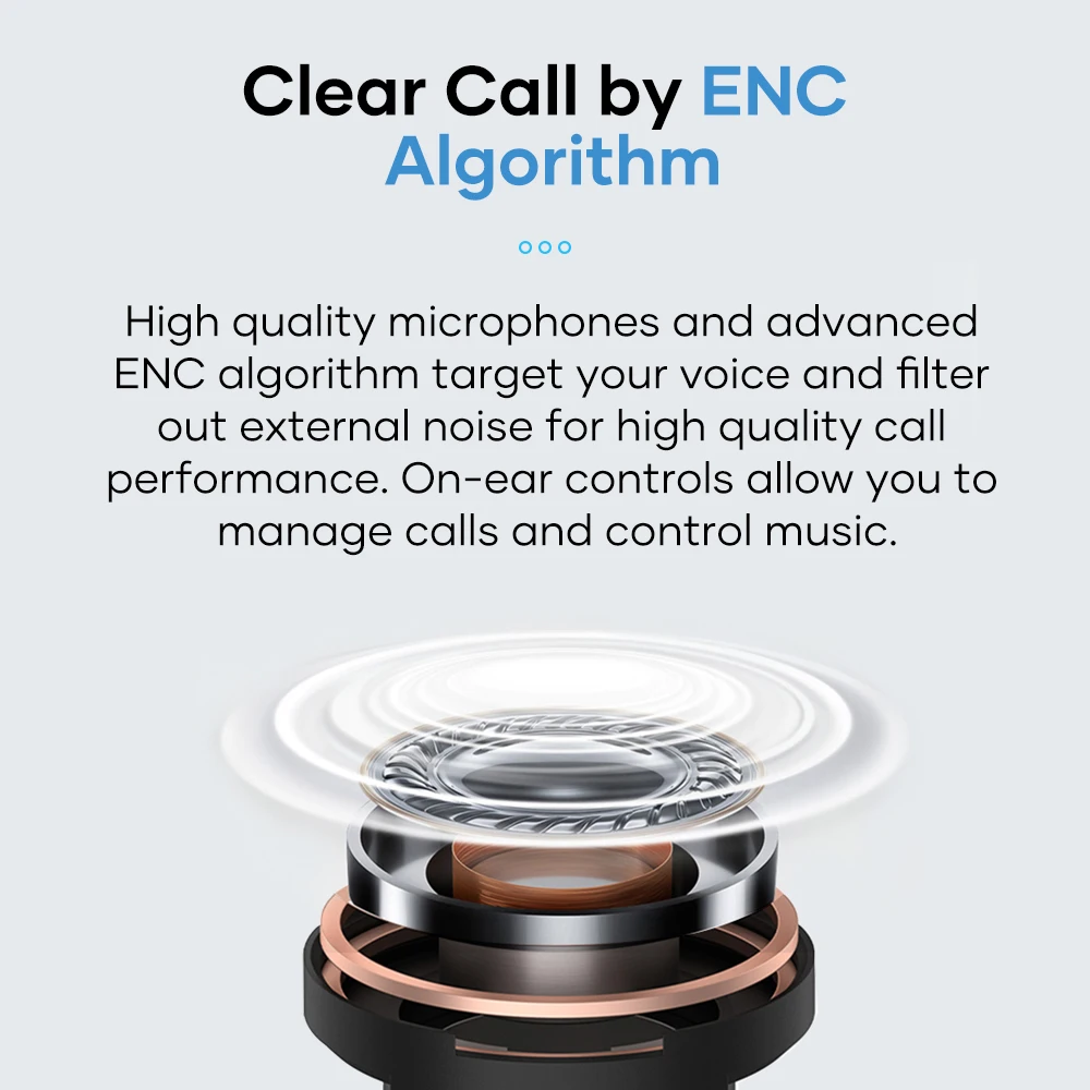 High quality microphones and advanced ENC algorithm target your voice and filter out external noise for high quality call performance. On-ear controls allow you to manage calls and control music.
