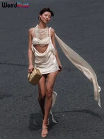 New Dresses 2025 Woman Fashion Summer Elegant Lace Up Dress Solid Pleated Slim Fit Party Bodycon Female Sexy Mini Skirt