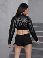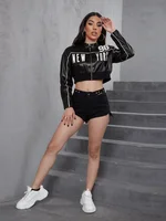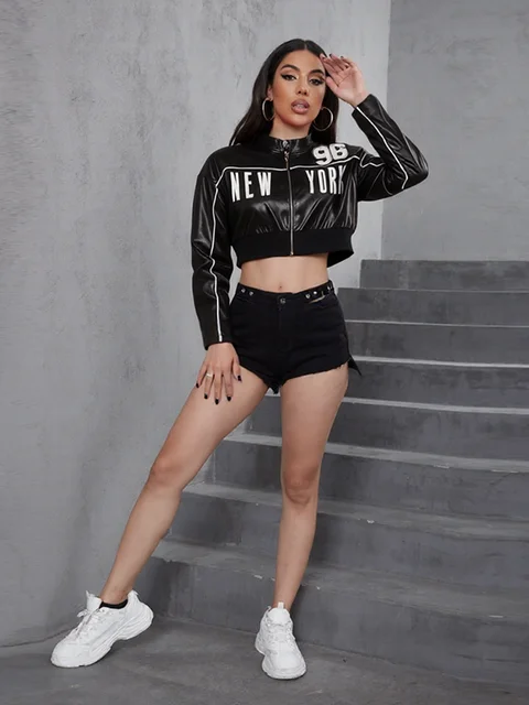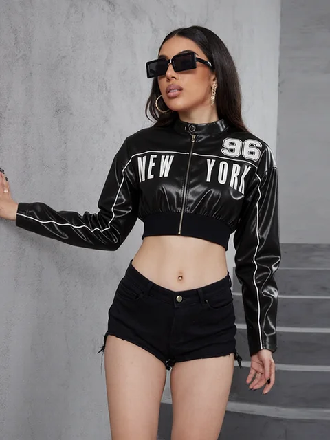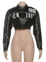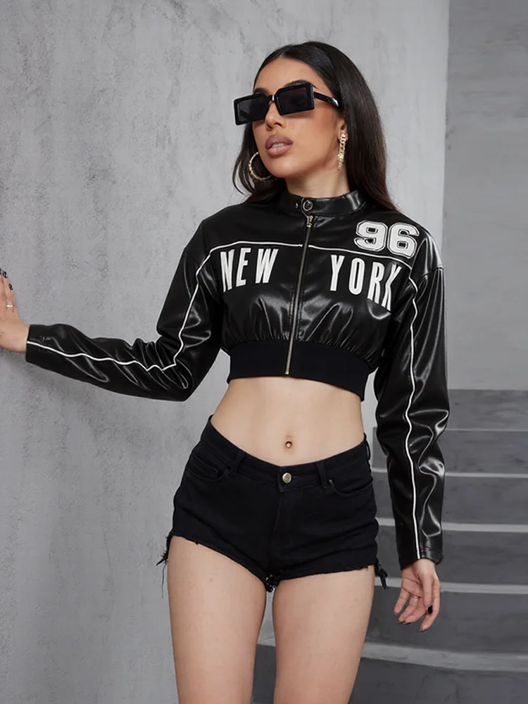 Weird Puss PU Patchwork Women Jacket Letter Print Hipster Button Zip Full Sleeve Trend Cool Street Spring