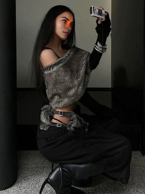 Be the first to review “Weird Puss Sexy Furry Patchwork T-Shirt Women Trend Slash Neck Full Sleeve Coquette Midnight Party Club”