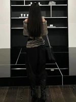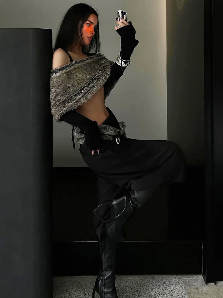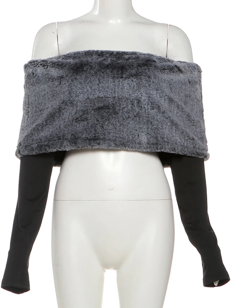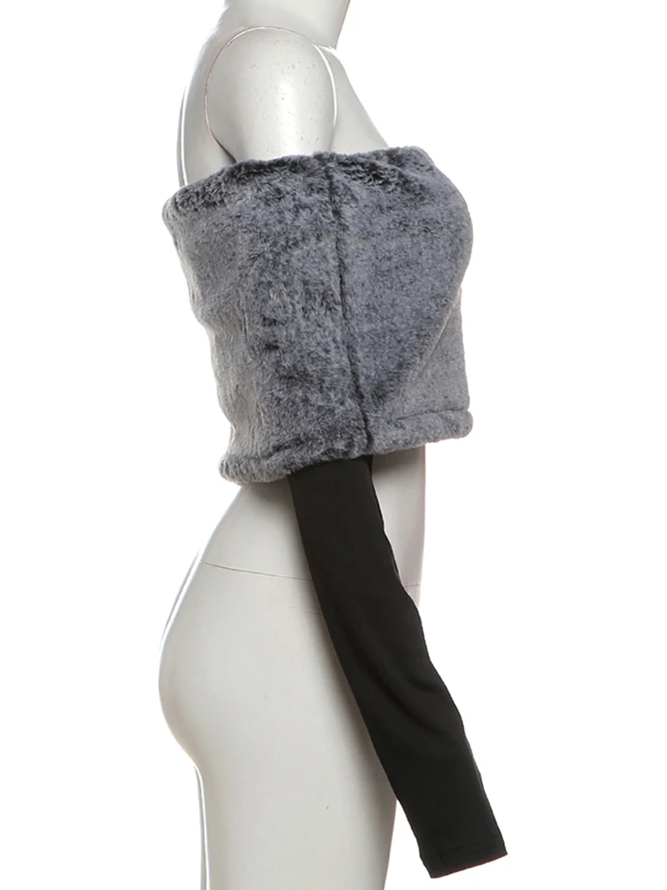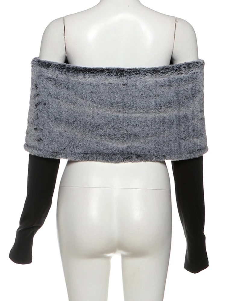 Weird Puss Sexy Furry Patchwork T-Shirt Women Trend Slash Neck Full Sleeve Coquette Midnight Party Club Stretch Skinny Crop Top