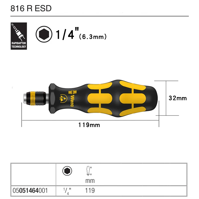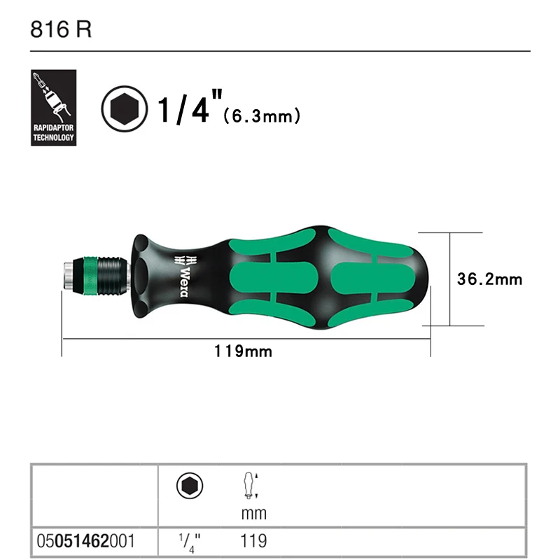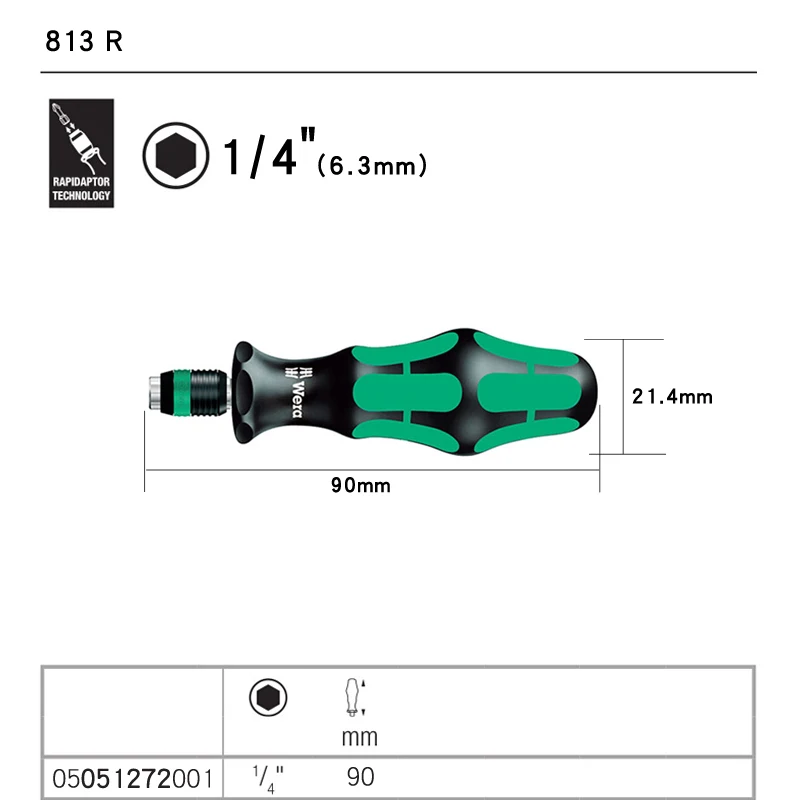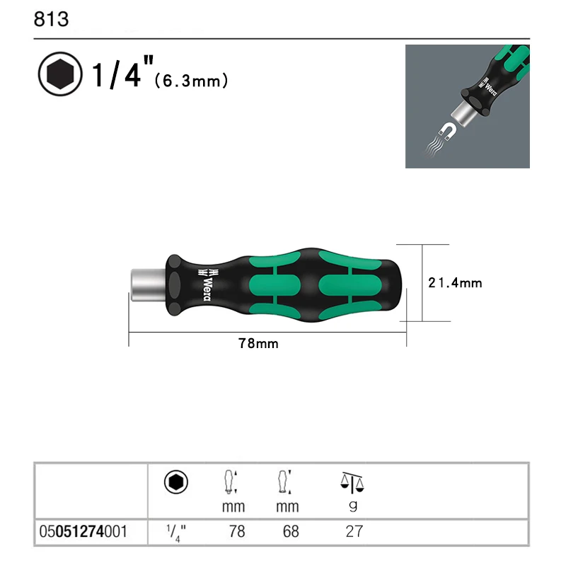 Suitable for bits with 1/4″ external hexagon drive as per DIN ISO 1173-C 6.3.