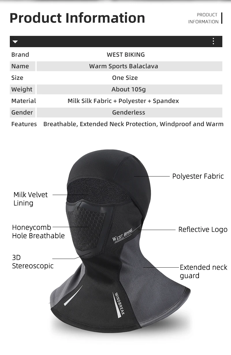 Features:Breathable,Extended Neck Protection, Windproof and Warm