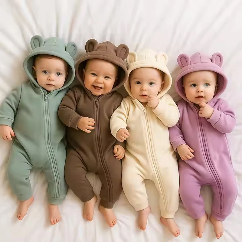 2025 Winter Baby Rompers Infant Fleece Bear Hooded Onesies Newborn Baby Boy Girl Zipper Jumpsuit Bodysuit Pyjamas