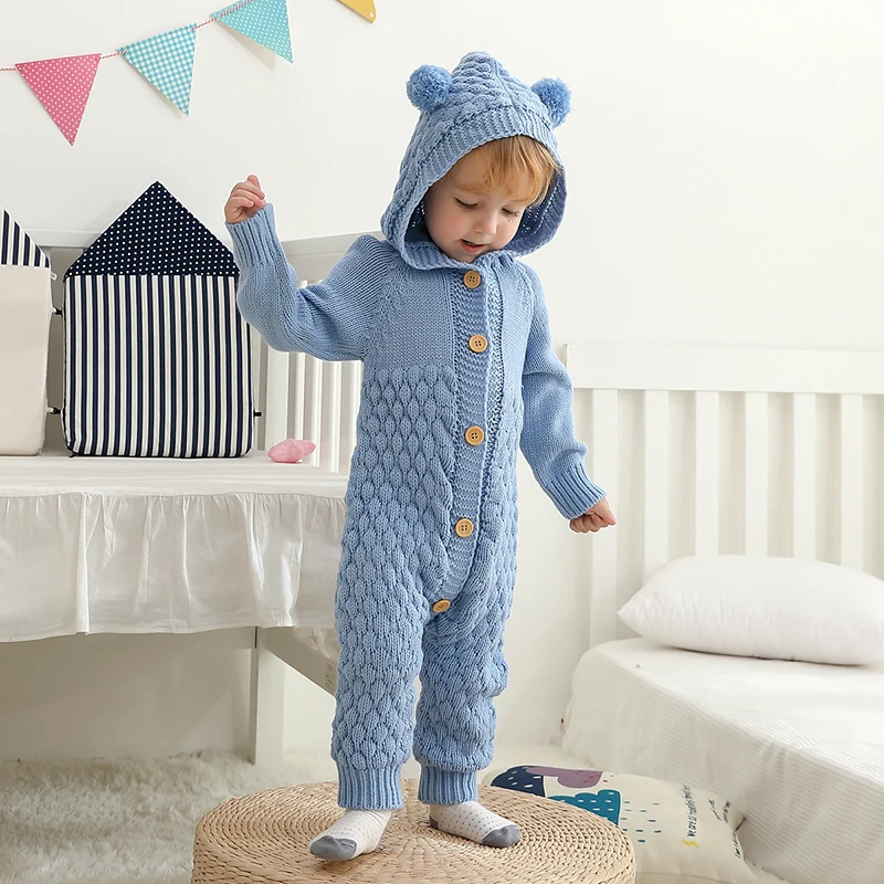 Winter Baby Rompers Clothes Autumn Solid Hooded Long Sleeve Knit Newborn Boys Girls Jumpsuits Playsuits