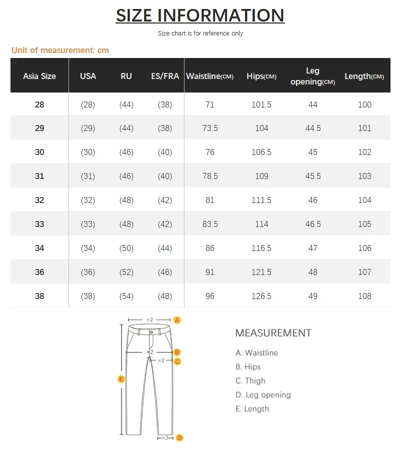 1. The size is Chinese size, pants size 32 = 32 inches waist = 81.5cm waist.