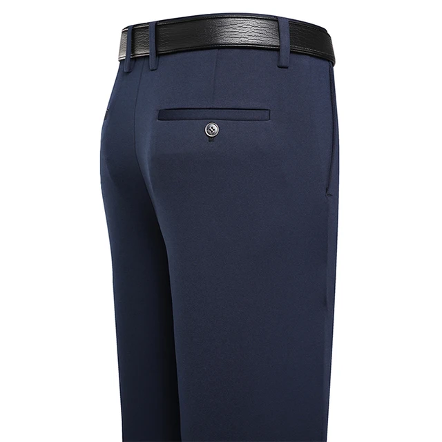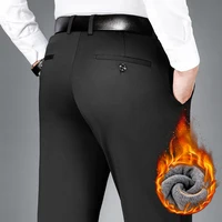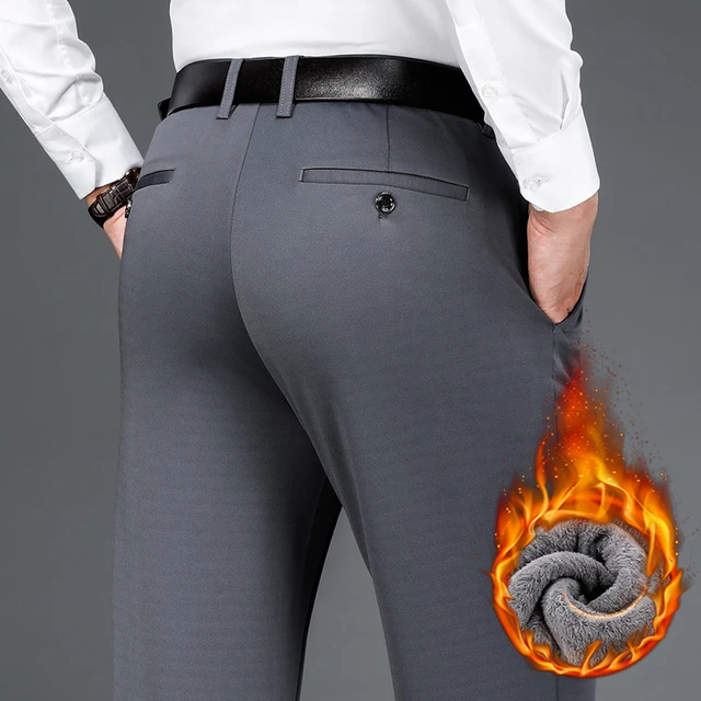 Winter Fleece Warm Pants Men Classic Business Work Office Navy Blue Black Elastic Waist Formal Suit Thick