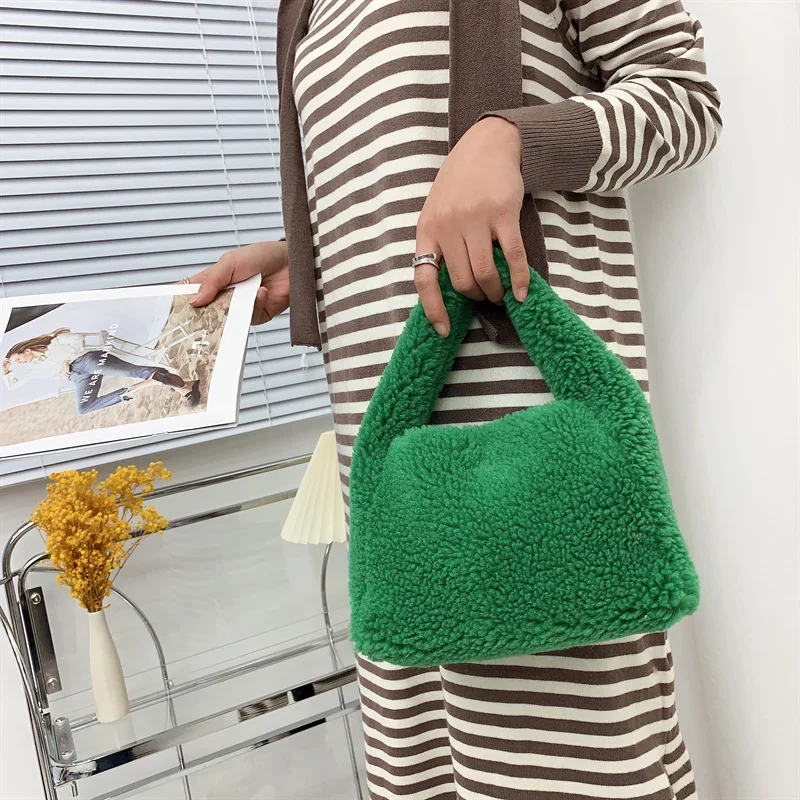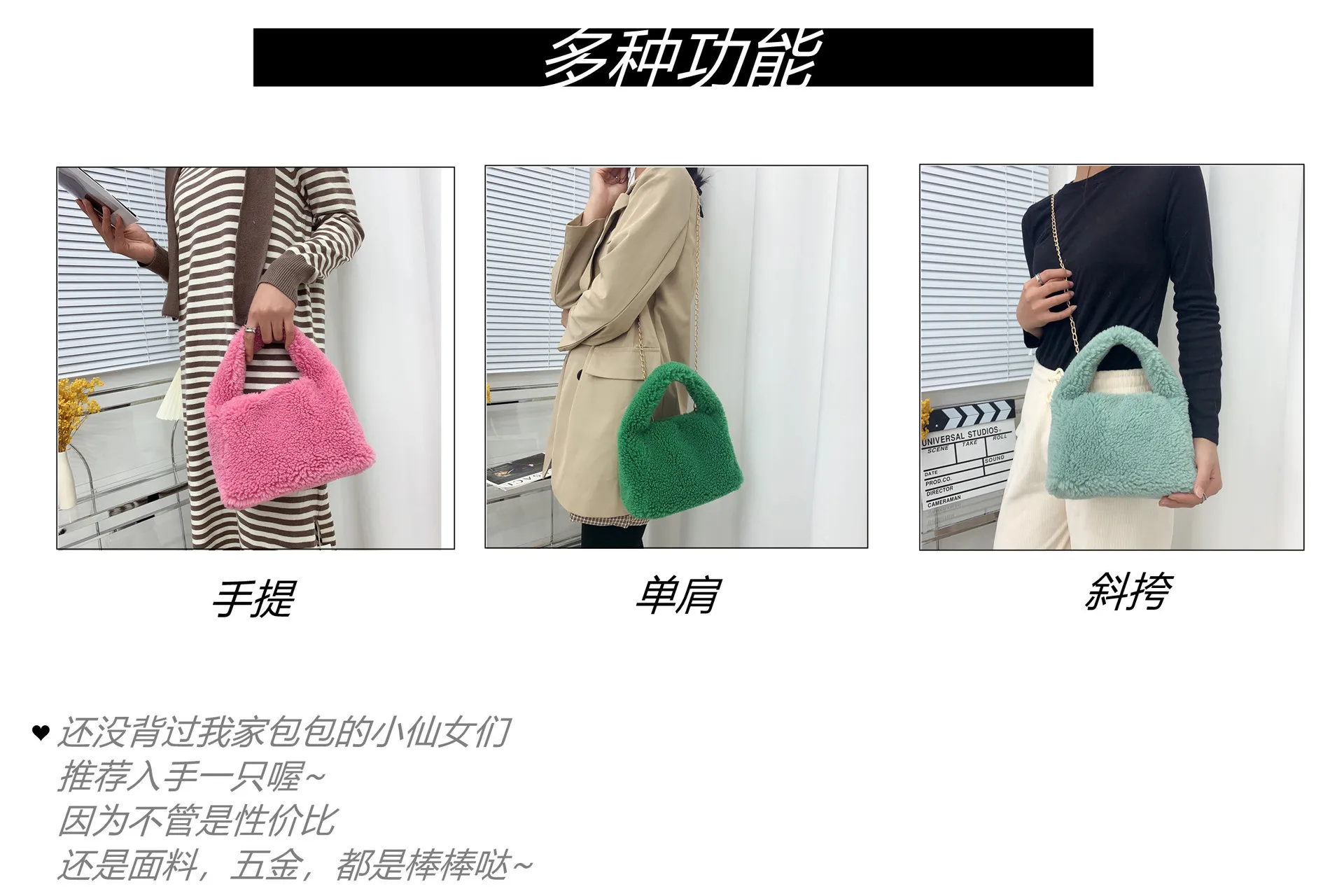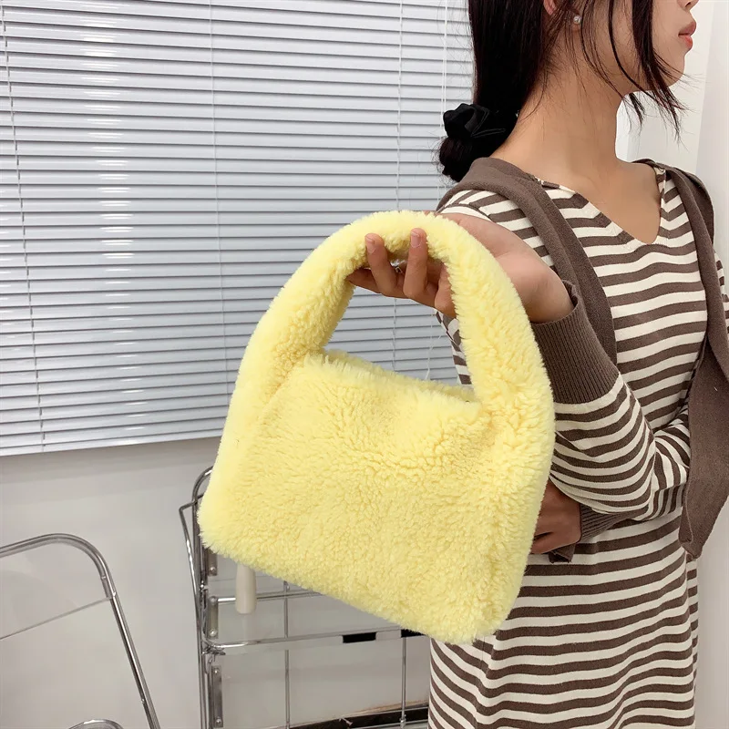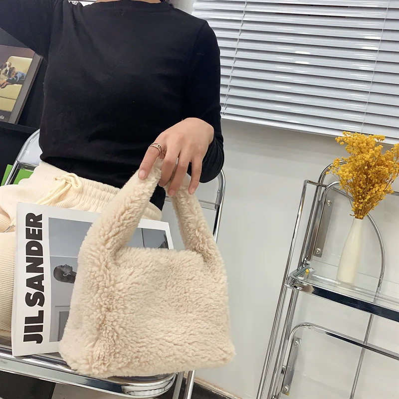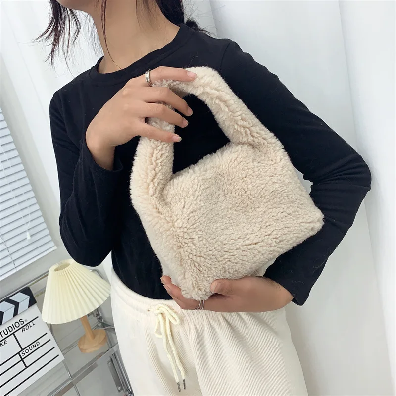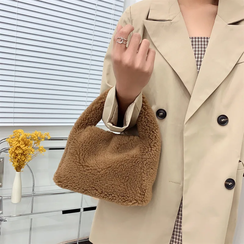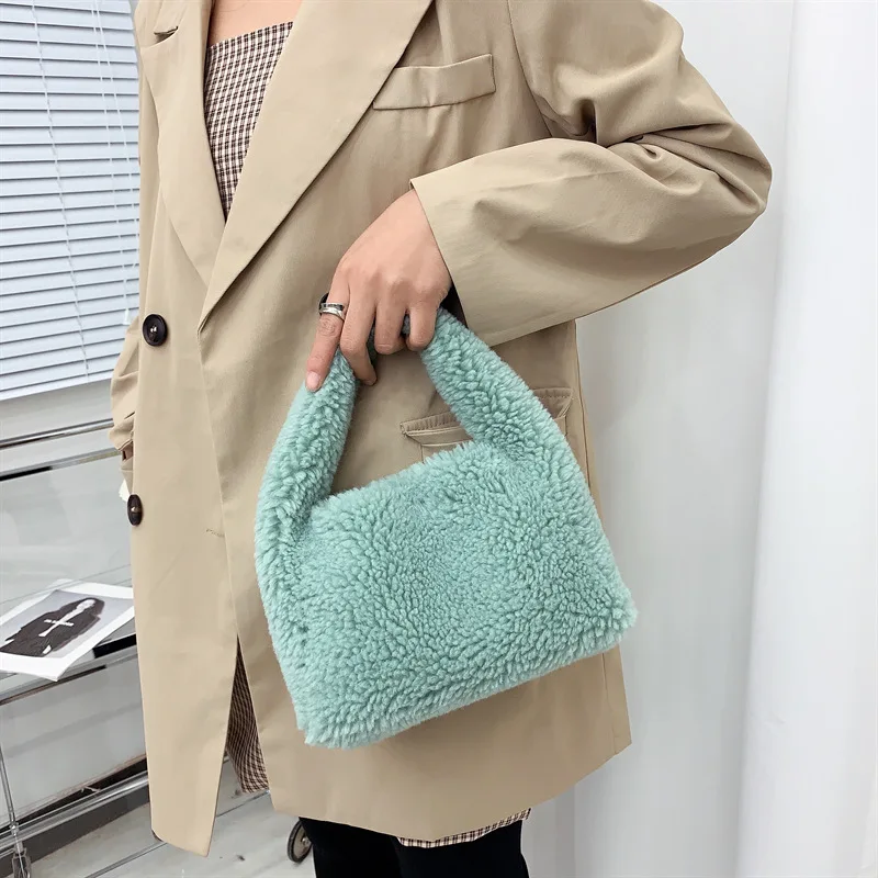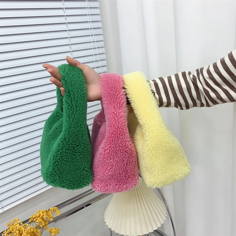 -61%Winter New Lamb Wool Small Bag 2023 Fashion Knotted Faux Fur HandBag Women’s Furry Short Handle Clutch Soft Plush Warm Bag