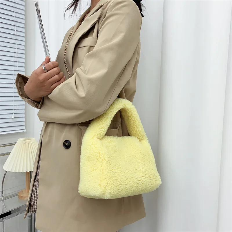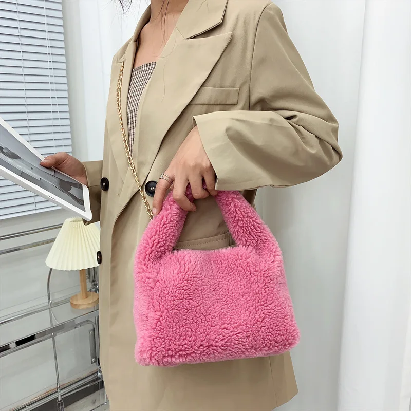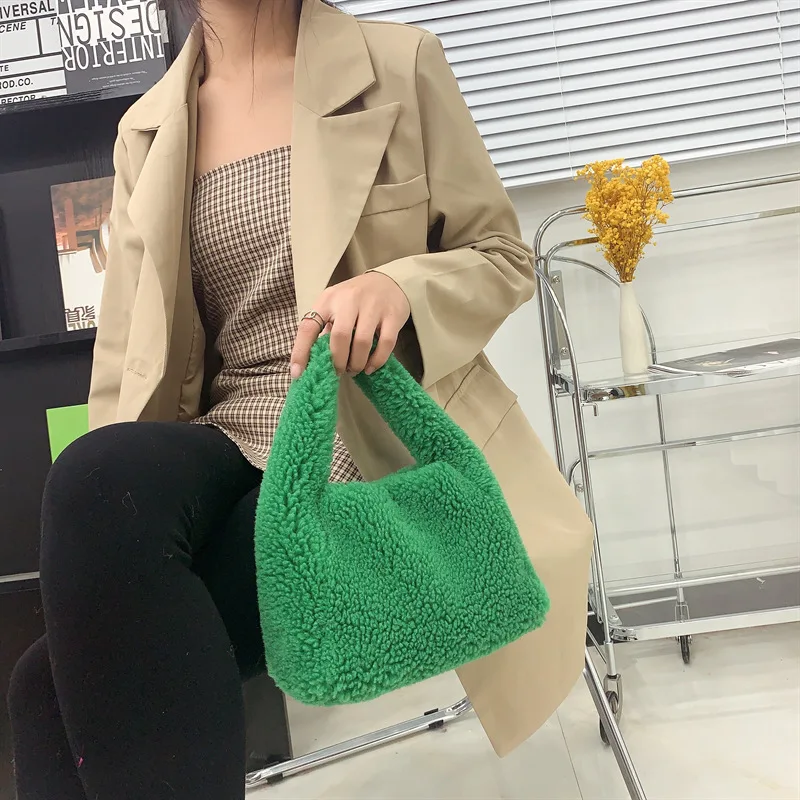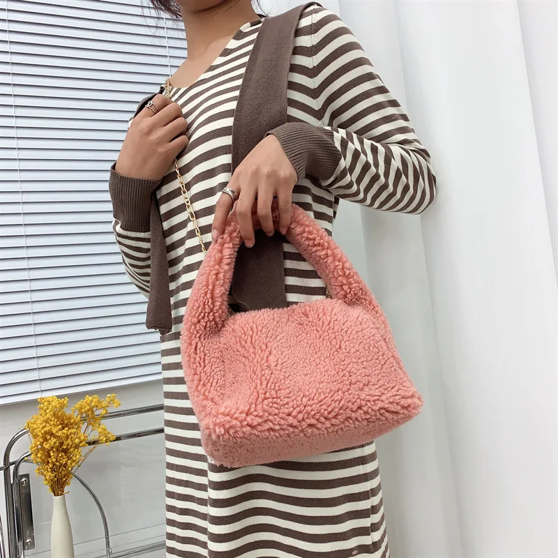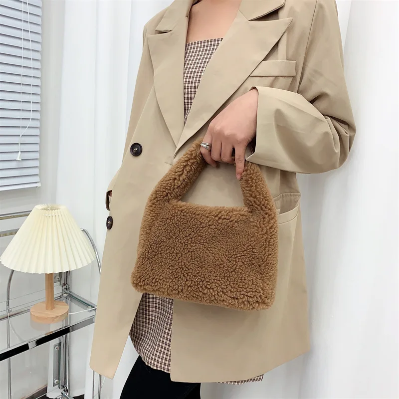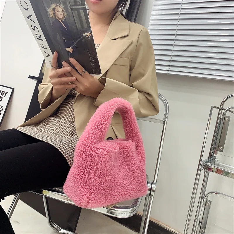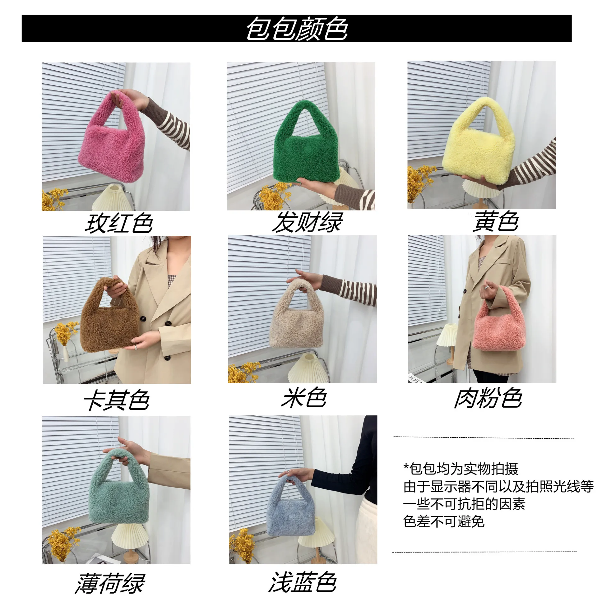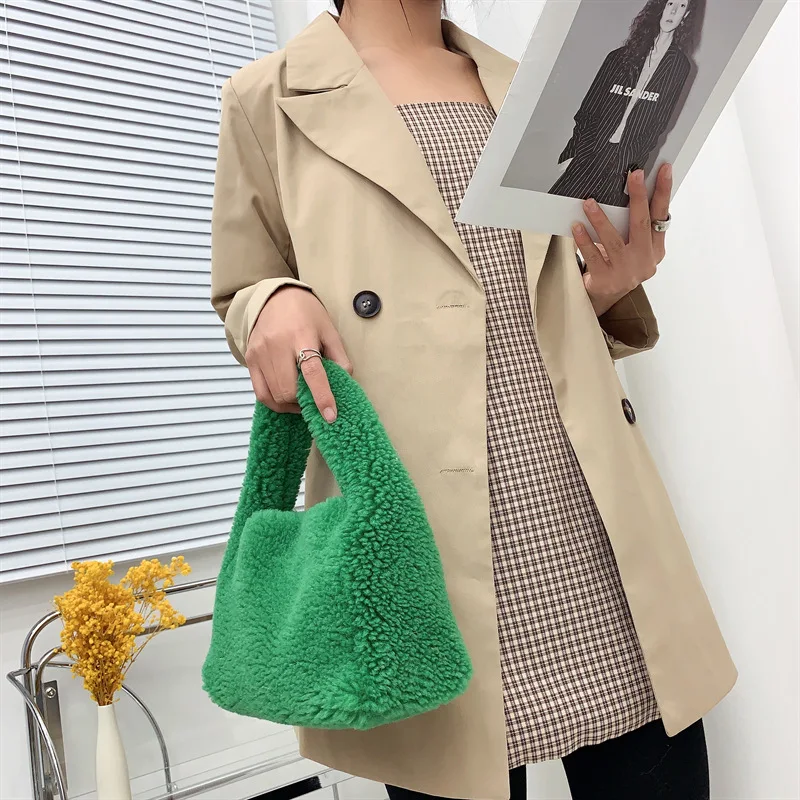 -61%Winter New Lamb Wool Small Bag 2023 Fashion Knotted Faux Fur HandBag Women’s Furry Short Handle Clutch Soft Plush Warm Bag