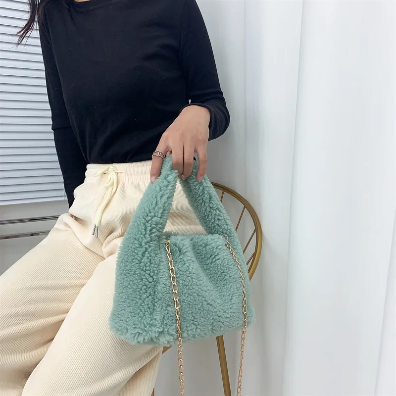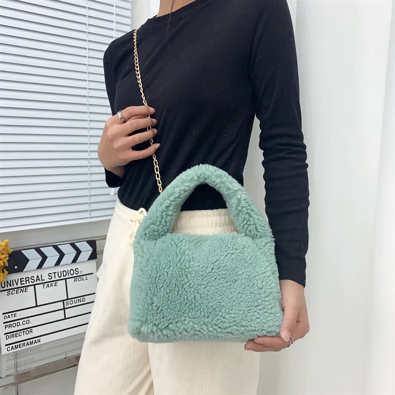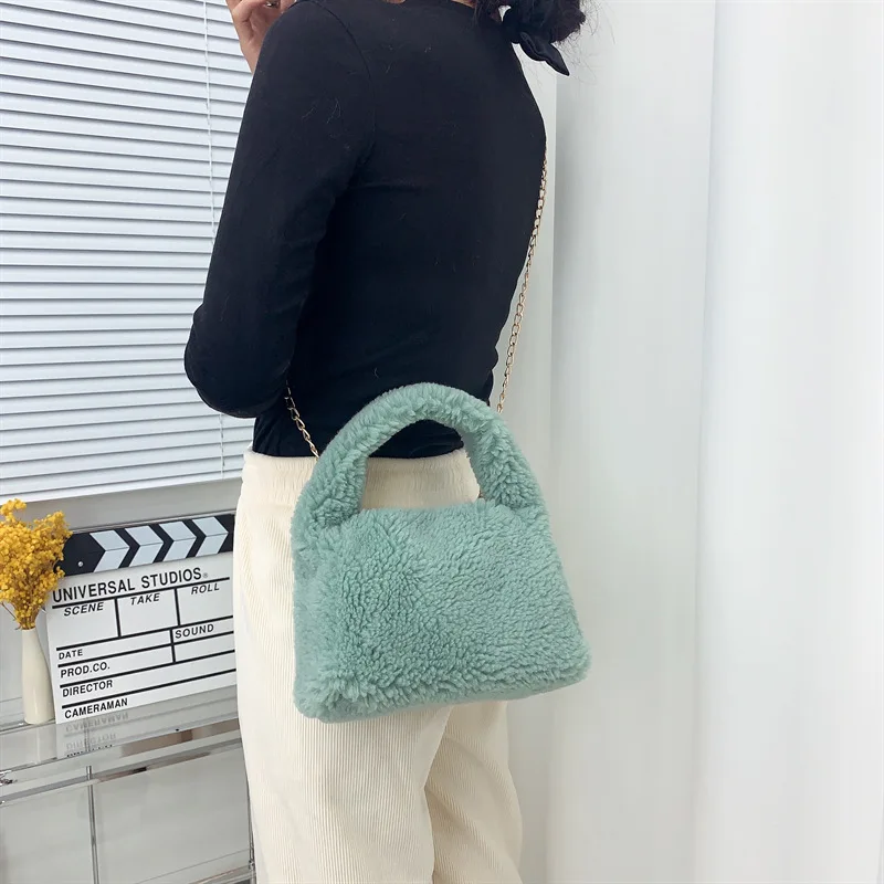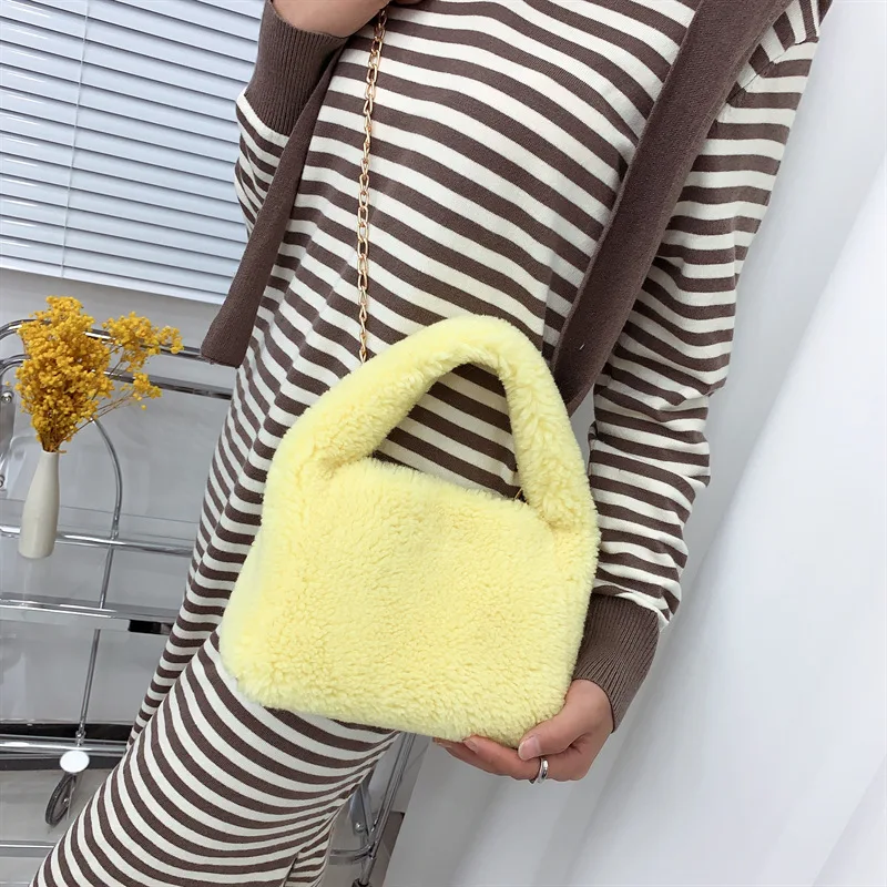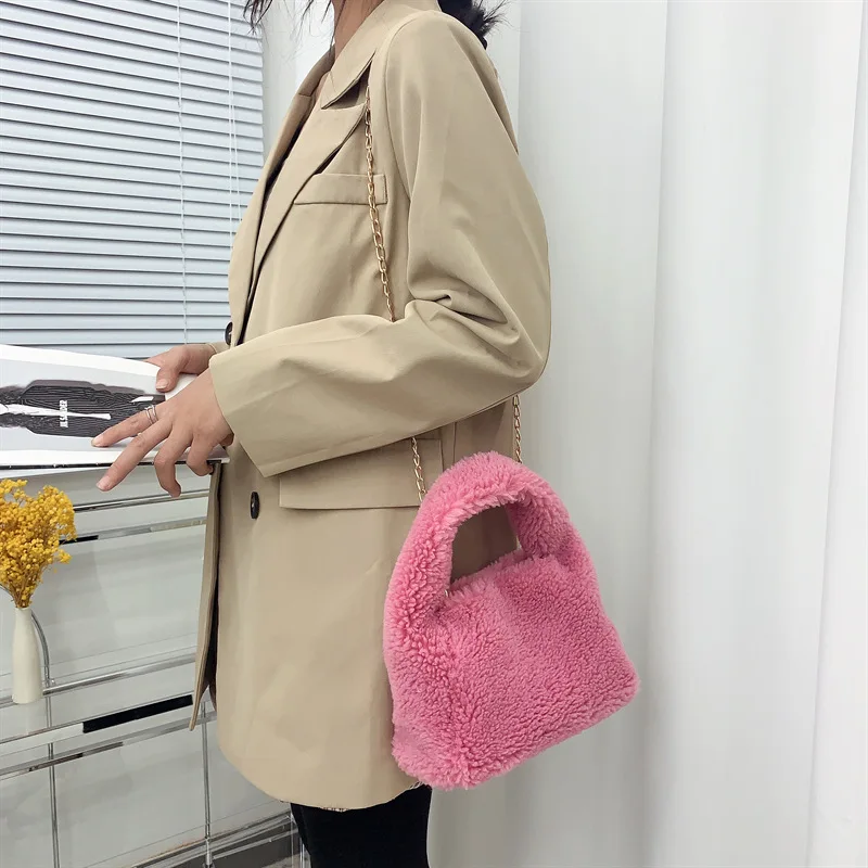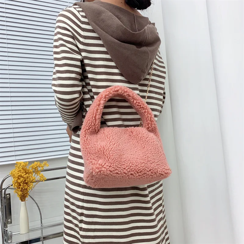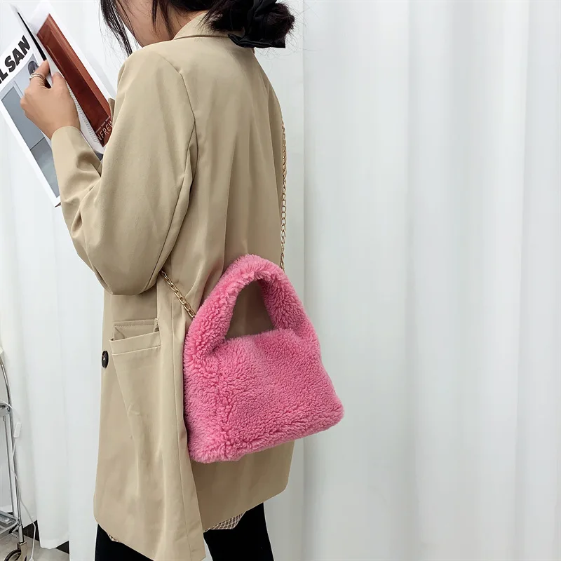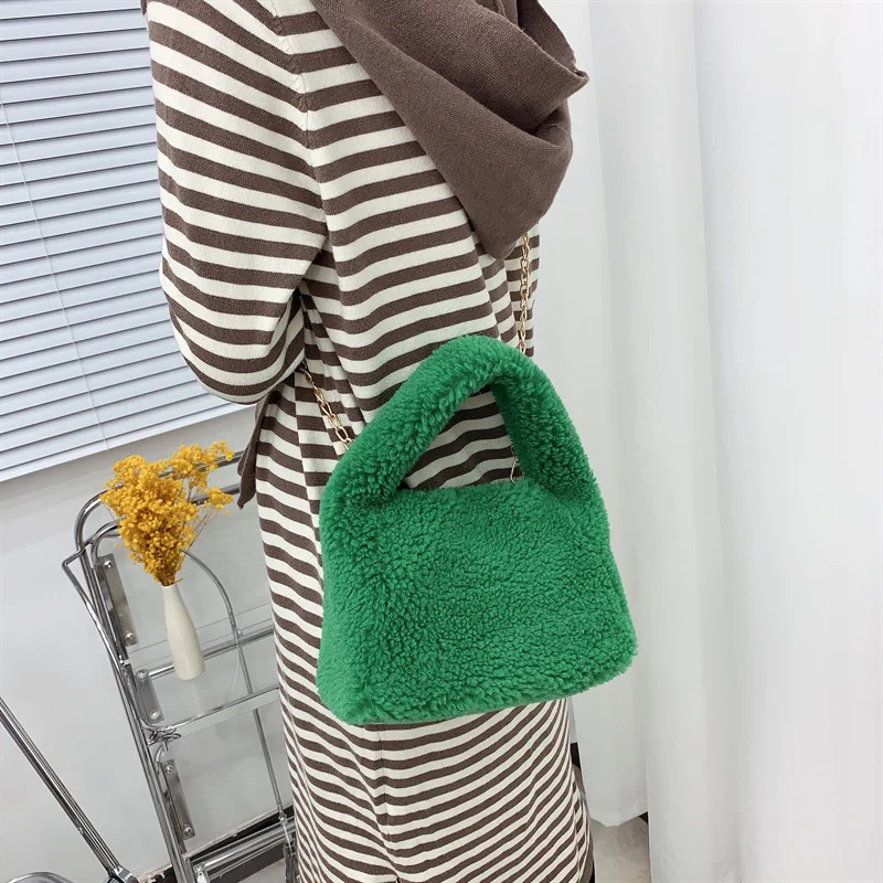 -61%Winter New Lamb Wool Small Bag 2023 Fashion Knotted Faux Fur HandBag Women’s Furry Short Handle Clutch Soft Plush Warm Bag