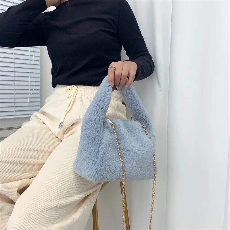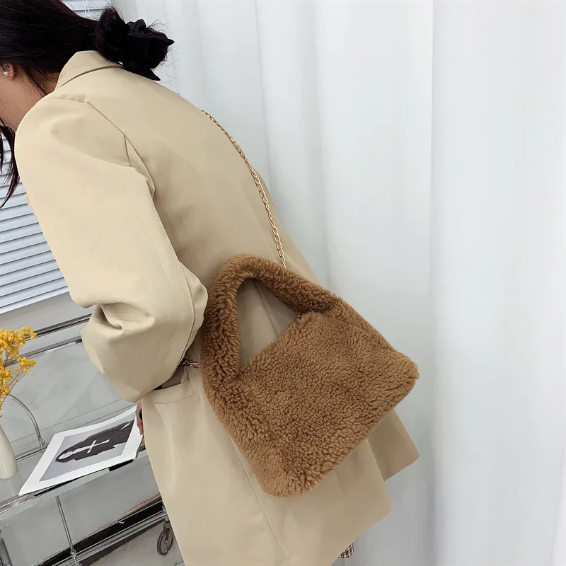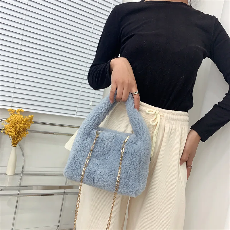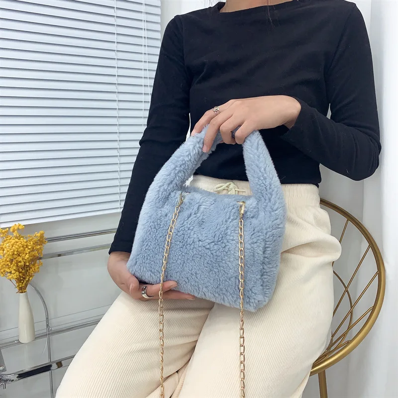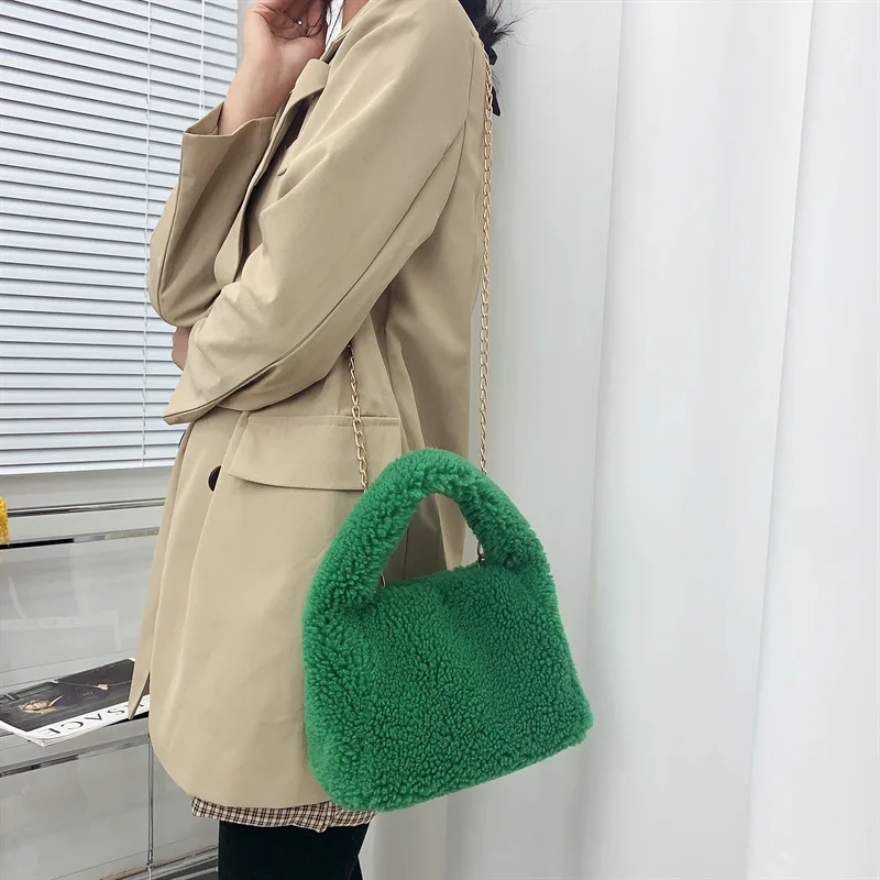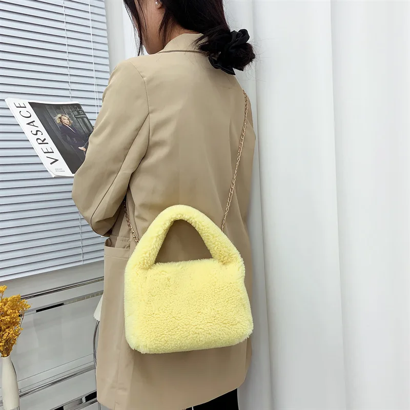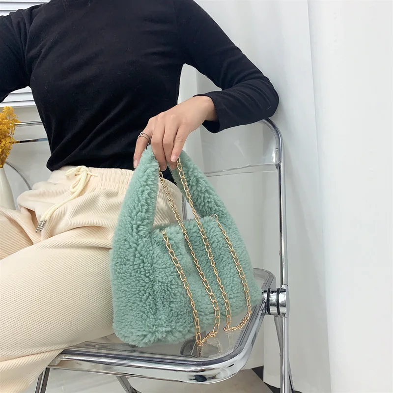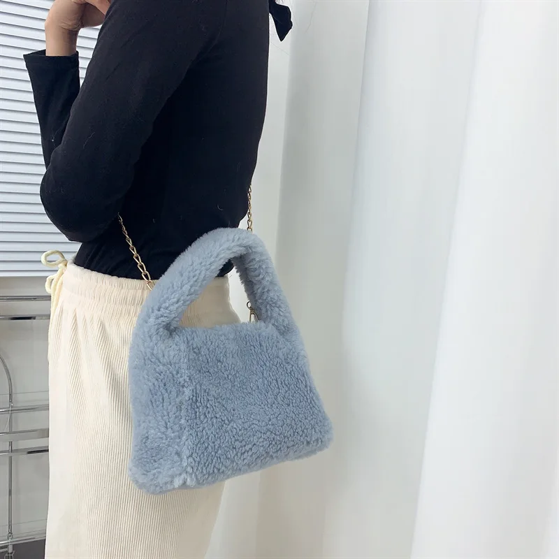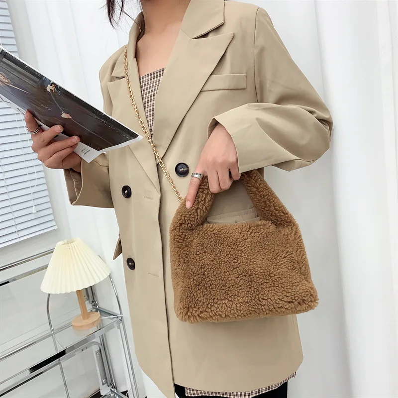 -61%Winter New Lamb Wool Small Bag 2023 Fashion Knotted Faux Fur HandBag Women’s Furry Short Handle Clutch Soft Plush Warm Bag