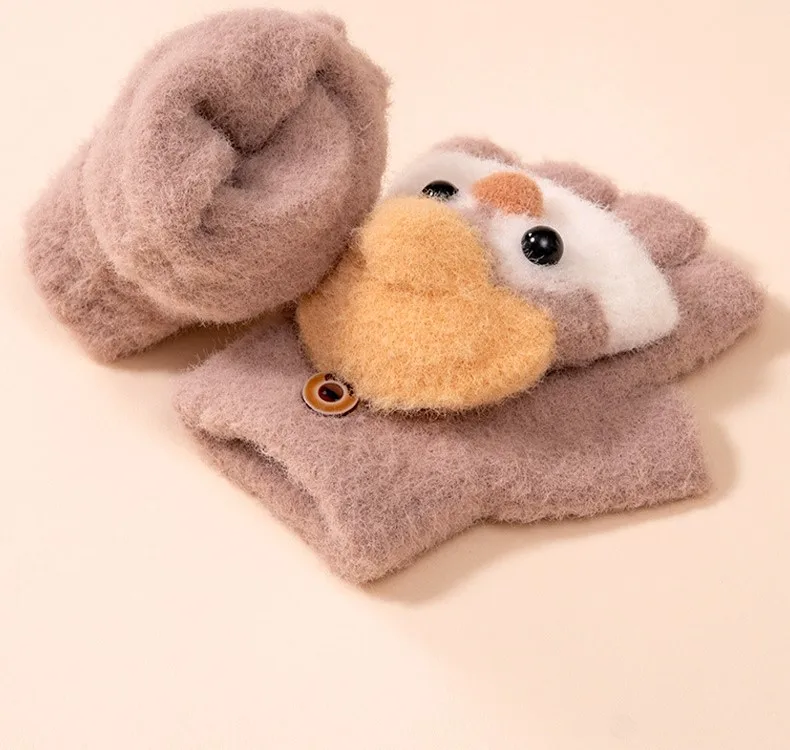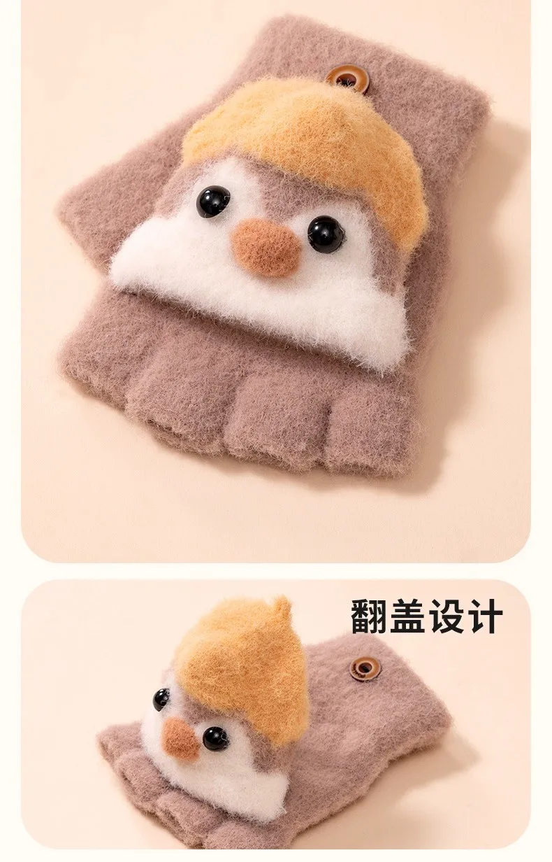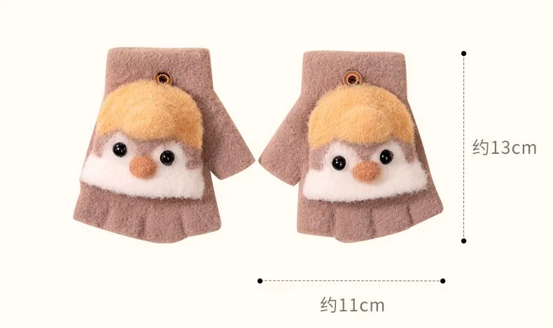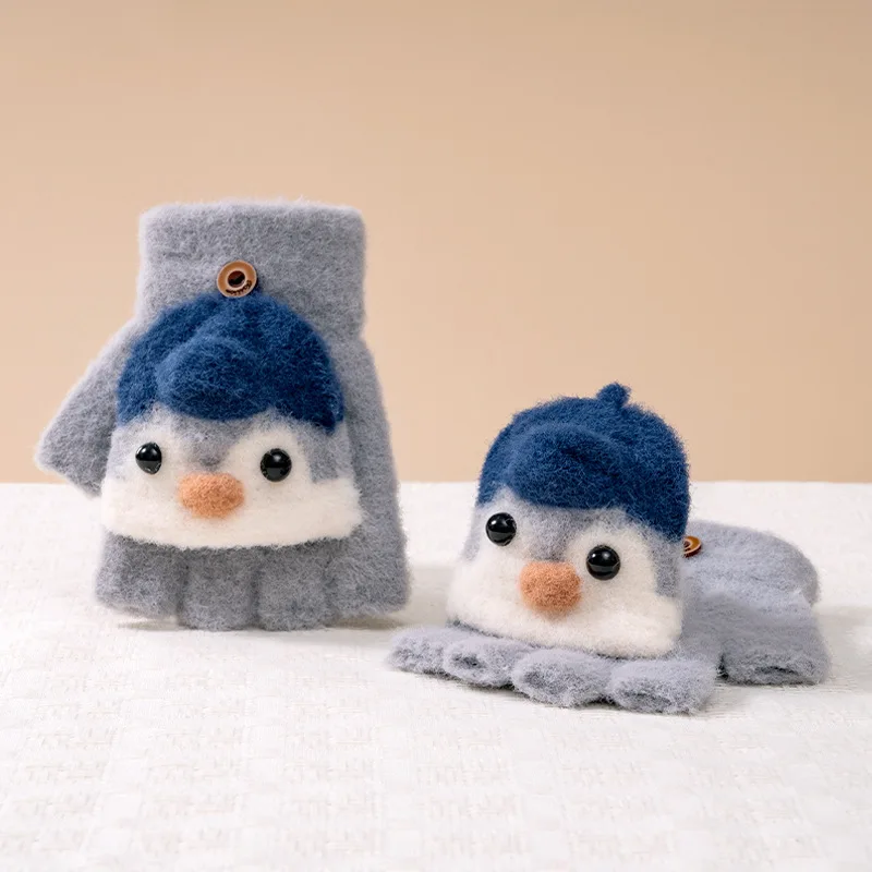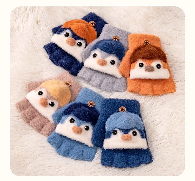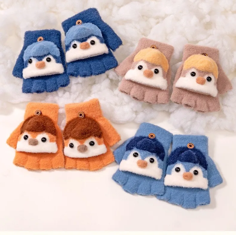 Winter School Students Writing Gloves with Flip Cover Boys Girls Cute Penguin Gloves Kids Warm Cartoon Five Fingers Gloves 3-10Y